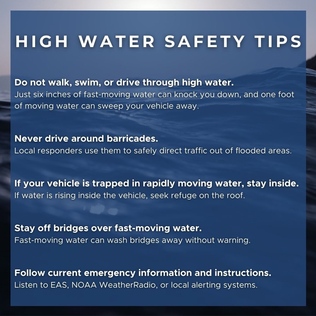 - Road closures and high-water signs will be placed in impacted areas.