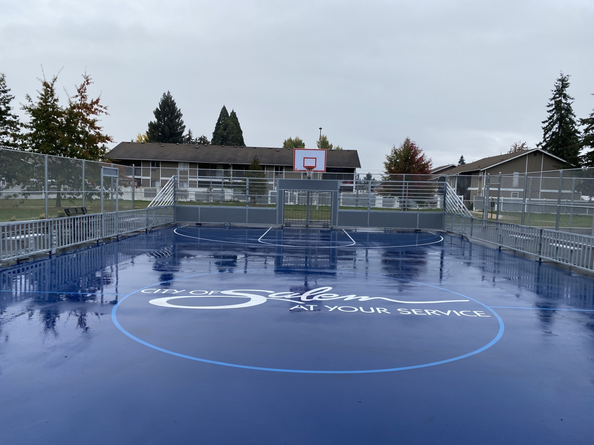 Damaged and unusable tennis courts are being replaced with new basketball hoops and a compact, paved soccer/futsal mini pitch. Hoops at both ends of the mini pitch will also support basketball. This is the only facility of its kind in the Salem-Keizer area.