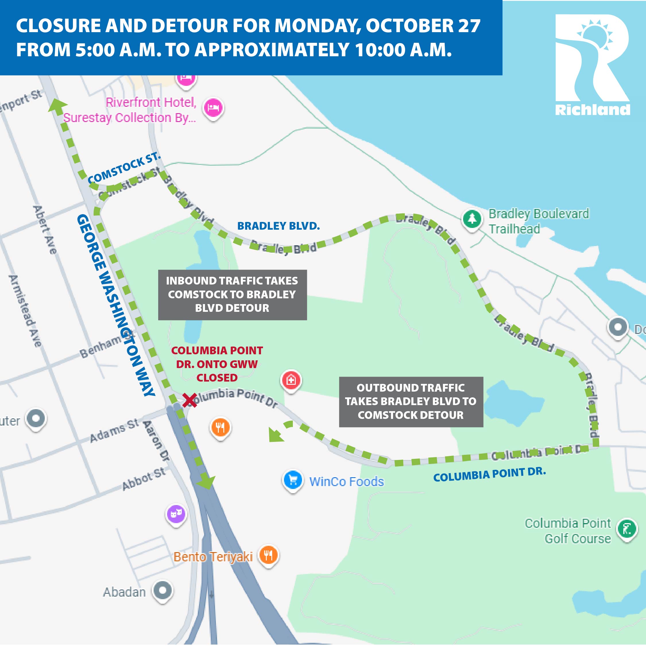 - Columbia Point Drive westbound onto GWW will be reduced to one lane.