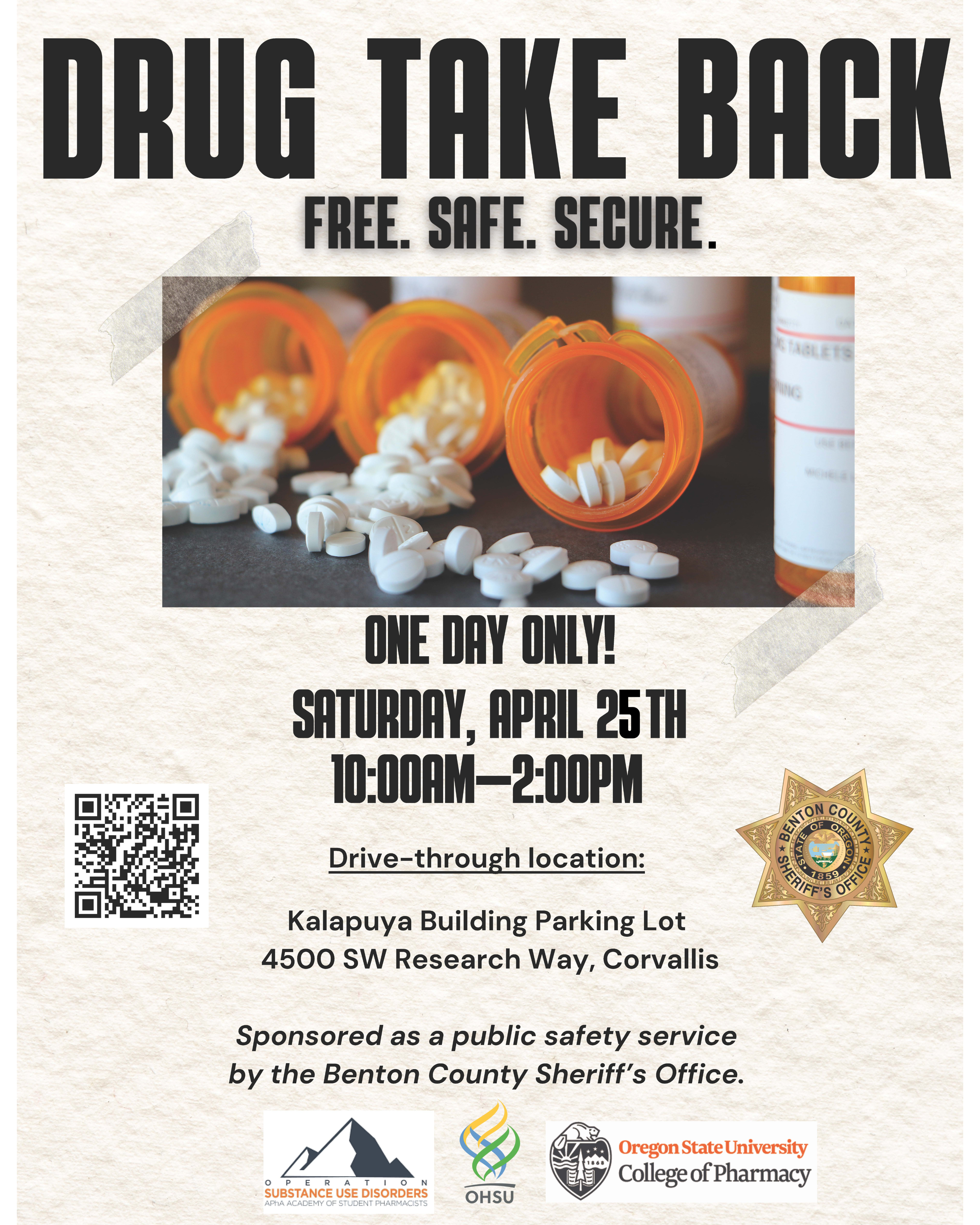 CORVALLIS, Ore. - The Benton County Sheriff’s Office is hosting a Drug Take Back Event on Saturday, April 25, 2026, from 10:00 am – 2:00 pm. This event allows the public to safely dispose of expired or unused medications.