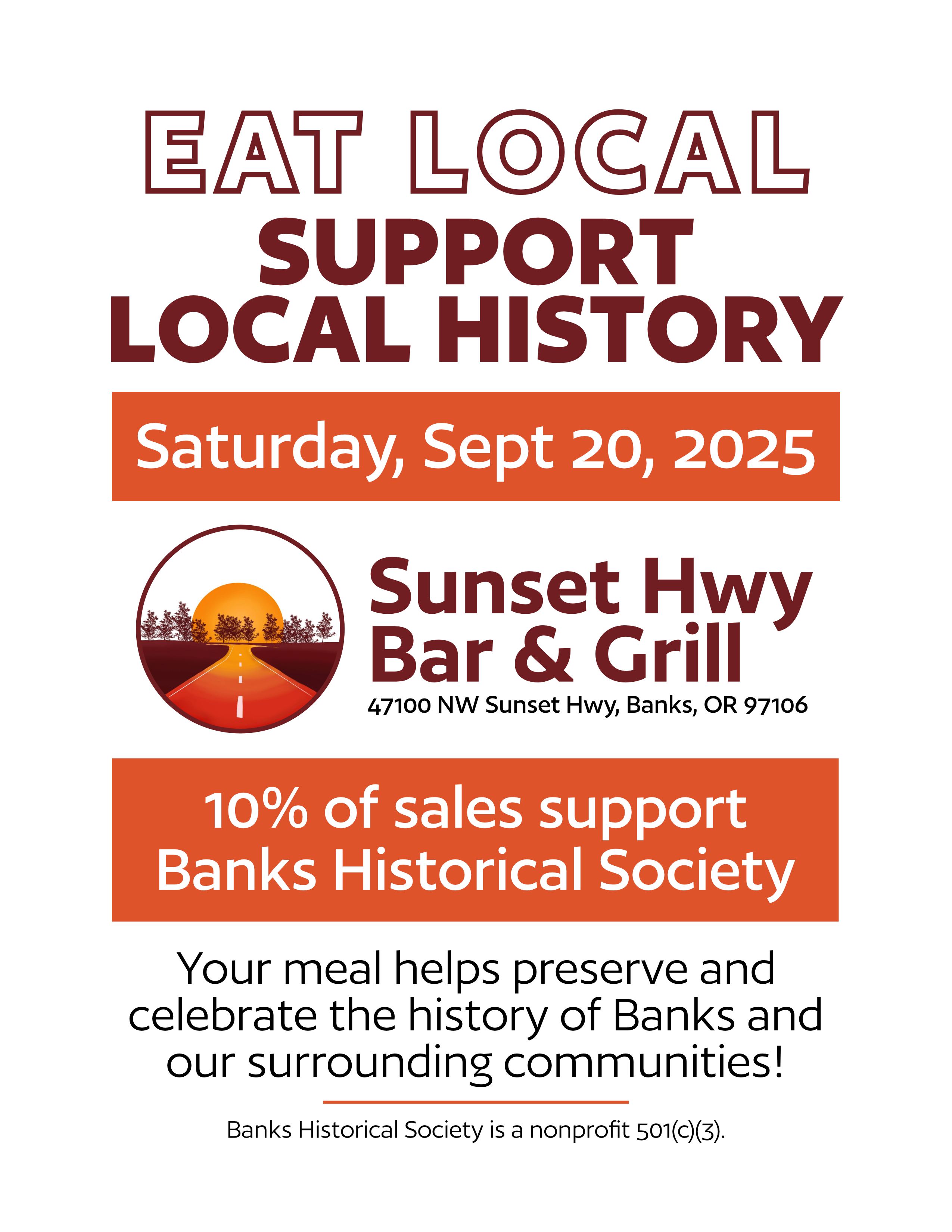From open to close, Sunset Hwy Bar & Grill will generously donate 10% of all sales to benefit the Banks Historical Society, an all-volunteer 501(c)(3) nonprofit organization.