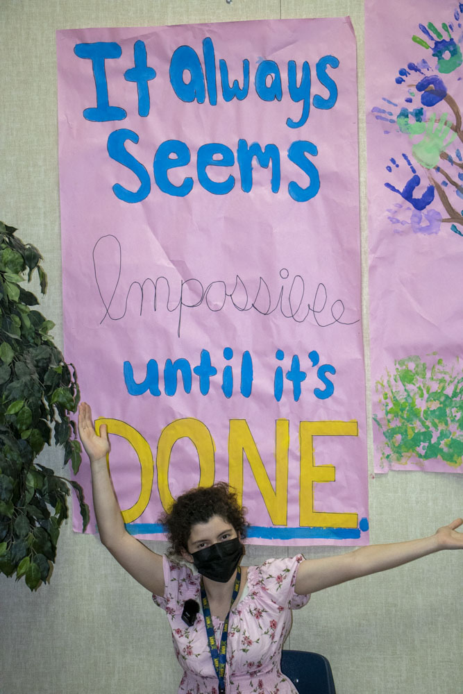 In the cafeteria, a giant banner says “thank you” to nutrition support staff who’ve made extra meals, including during school breaks and over the summer. Another is for custodial staff who’ve worked extra hard to clean and sanitize the school throughout the year, especially after students returned to buildings. Other students have taken on the role of “secret pal” for staff members, leaving them encouraging messages. Students also created a video for staff that is filled with messages of support from students all over the school.