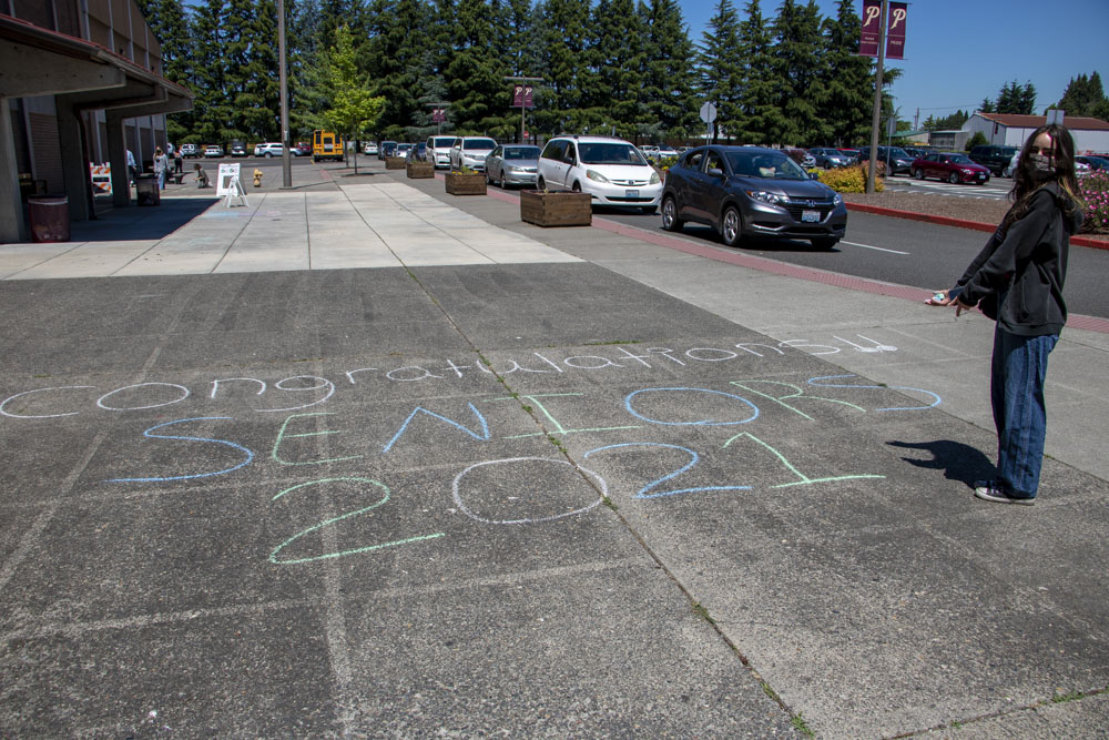 Inside the building, senior Hannah Hollenbeak poses under the banner she created. It reads “It always seems impossible until it’s done.” Outside, junior Lily Wilder finishes a giant chalk drawing congratulating the graduating class of 2021. On Thursday, another student brought dozens of flowers from her own garden to be handed out to teachers in their classrooms. Others passed out watermelons or Subway gift cards to counselors and other staff members throughout the week.