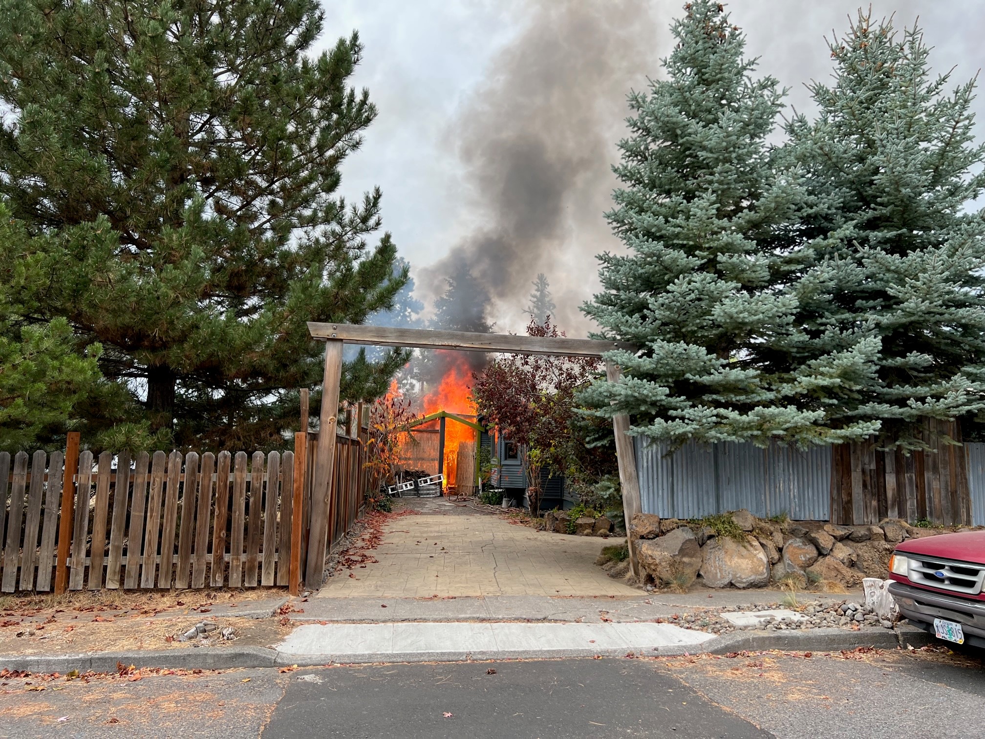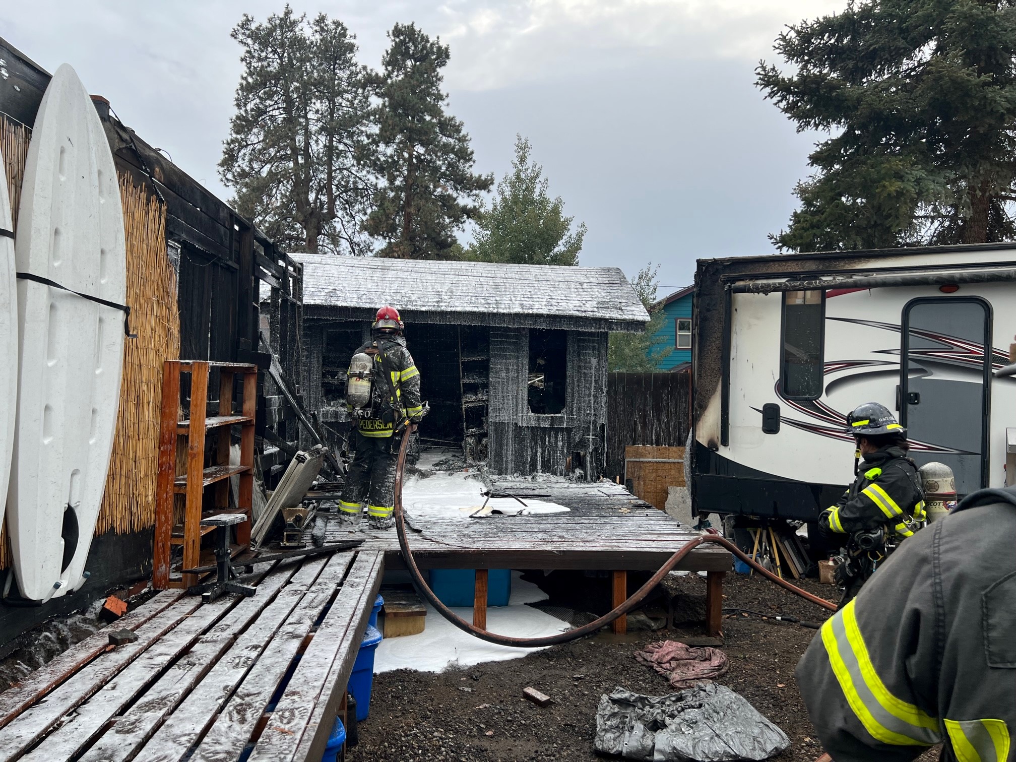 At 4:02 pm on October 21, 2022, Bend Fire & Rescue was dispatched to a possible structure fire in the area of NW Delaware Street. While en route, a large column of smoke was visible and additional units were added. On arrival, a working fire was found involving an outbuilding, deck, and a large travel trailer. The fire was just beginning to extend to the residence as crews arrived, and they were able to minimize the damage to the residence and quickly knock down the fire. Complete extinguishment of the shed was challenging as the roof structure consisted of multiple layers of old roofing. The 764 square foot residence was constructed in 1915, the adjacent 120 square foot shed was constructed in 1920. Damages are estimated at $60,000 to the structure, $50,000 to the contents, and $15,000 to the 2015 Forest River travel trailer.