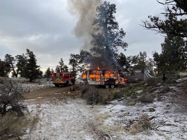 At 8:00 am on Thursday, February 8, 2024, Bend Fire & Rescue and the Deschutes County Sheriff's Office responded to multiple reports of smoke coming from the Juniper Ridge area along the east side of Hwy 97 north of Wiley Circle. Upon arrival a fully involved 24 foot travel trailer was found, with no extension to nearby trees and vegetation.