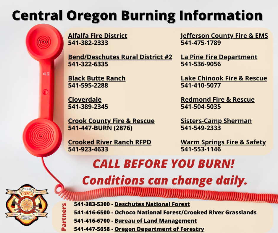 - Call before you burn. Weather conditions can change quickly and burning can be closed as needed. If you are within Rural District #2, please call 541-322-6335 before lighting a fire to ensure burning is open for the day.
