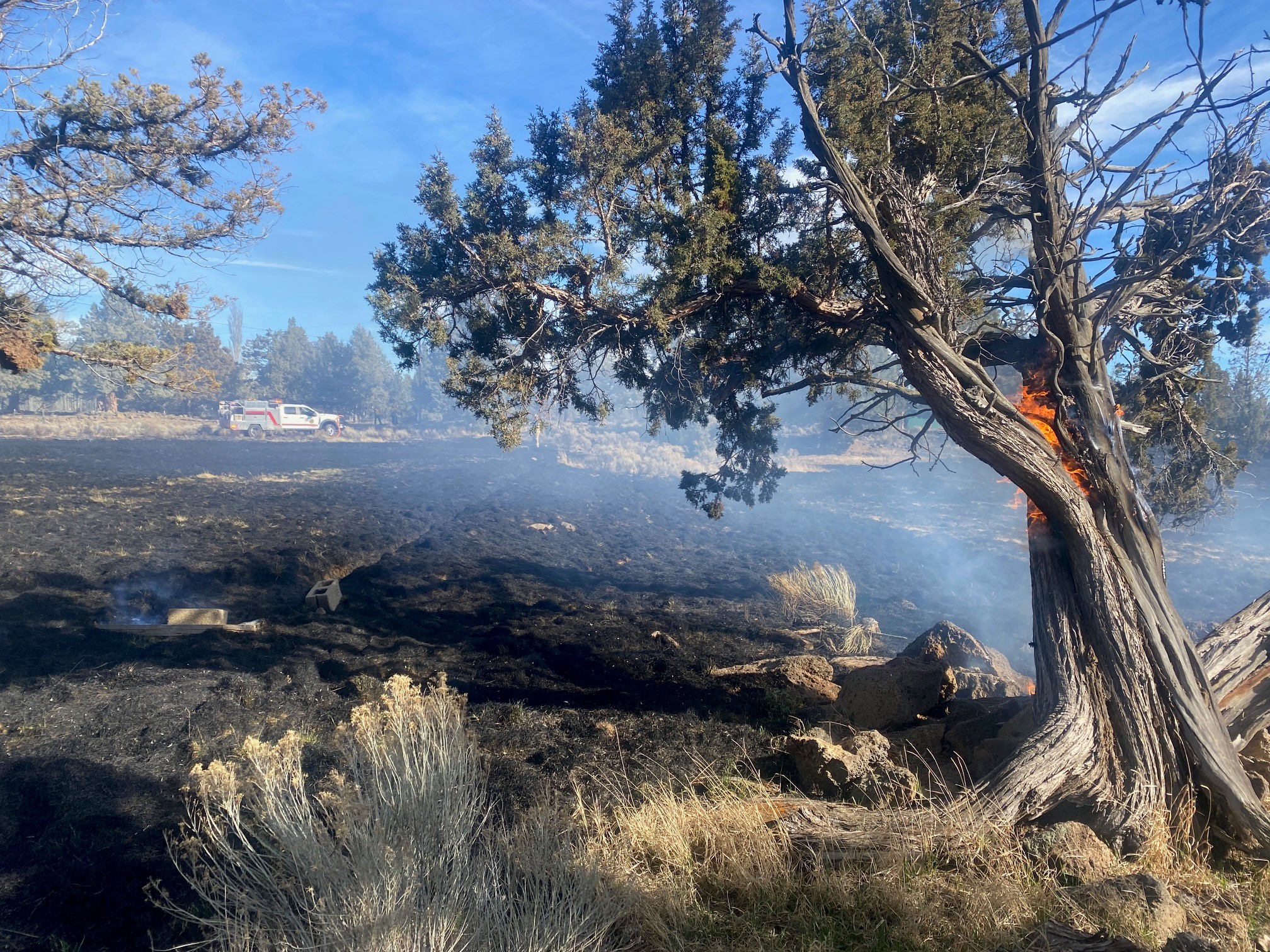Bend Fire & Rescue was called to an escaped field burn this afternoon off of Powell Butte Hwy. The owner was out burning his ditches when the wind carried the fire past his containment and started to spread. Fire crews arrived and worked to stop the spread of the fire before it left the owners property. Bend Fire was assisted by Alfalfa Fire, ODF and BLM fire resources as well as DSCO for traffic control. The fire was stopped on their property at 6.6 acres. No damage to buildings or fences as found. The fire burning mostly pasture land with a few trees, brush piles, and brush surrounding the fields burning as well.