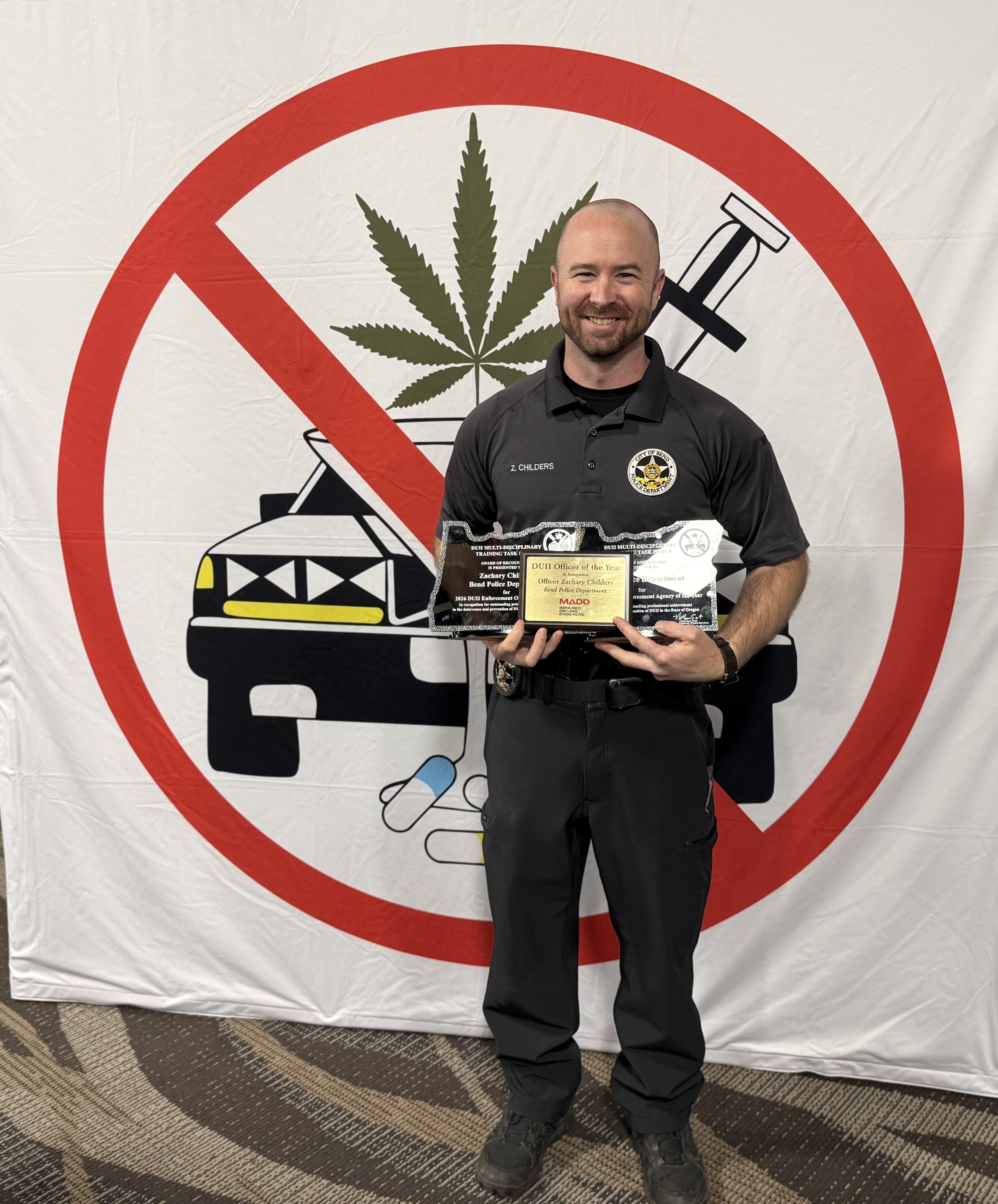 In 2025, Bend Police arrested more than 550 people for DUII. Officer Childers made 151 of those arrests. His commitment to keeping our roads safe by finding and arresting impaired drivers makes a huge different in our community, and we are proud of his work and his award.