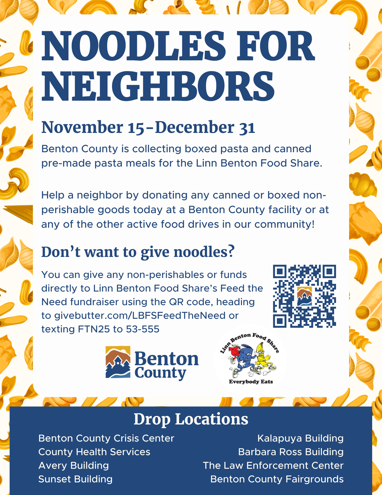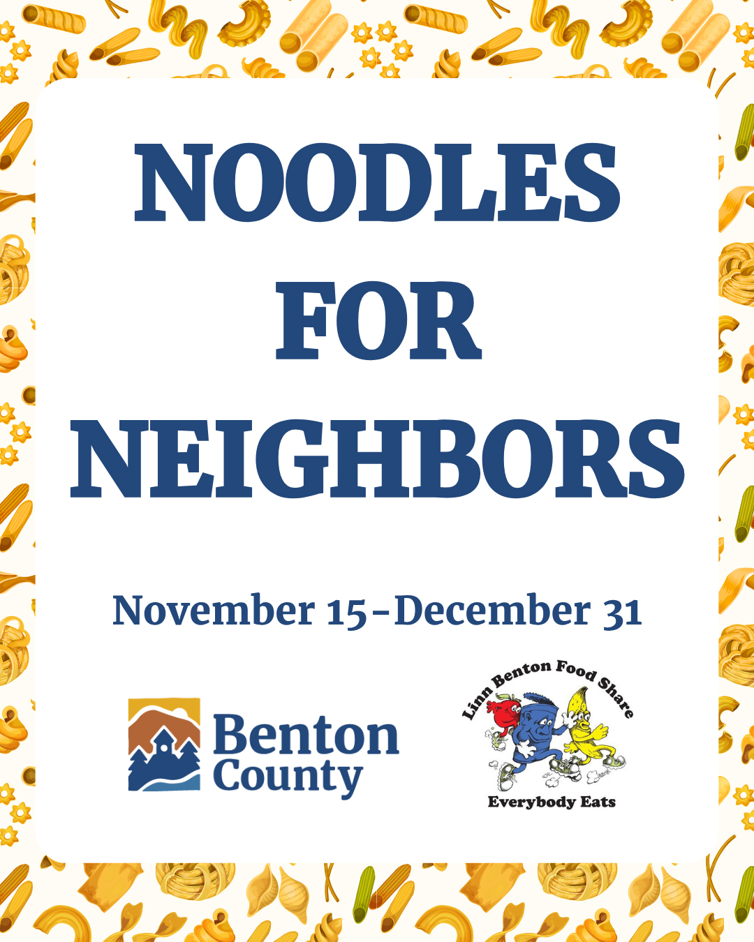 Parade attendees are encouraged to bring nonperishable food to support Noodles for Neighbors, Benton County’s food drive. Donation bags will be placed at each street corner along the parade route. Food will be donated to Linn Benton Food Share, which provides food to 29 food pantries, meal sites, senior care facilties, group homes and other member agencies in Benton County.