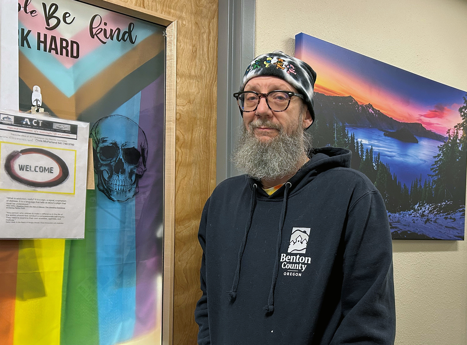 Chris McFarland stands outside his office at the Benton Health Center in Corvallis, Ore. McFarland works as a counselor, supporting individuals with serious mental illness through community-based care. (Photo courtesy of Benton County)