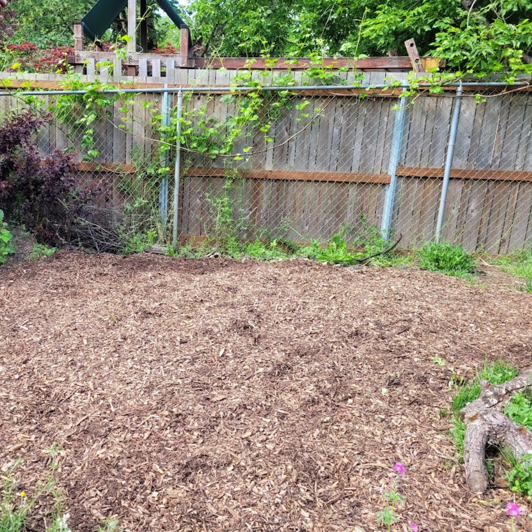 A before and after view of a small habitat project at a suburban home in Philomath. The lawn and weeds were smothered by wood chips before adding native plants. Photo credit: Sara Roberts