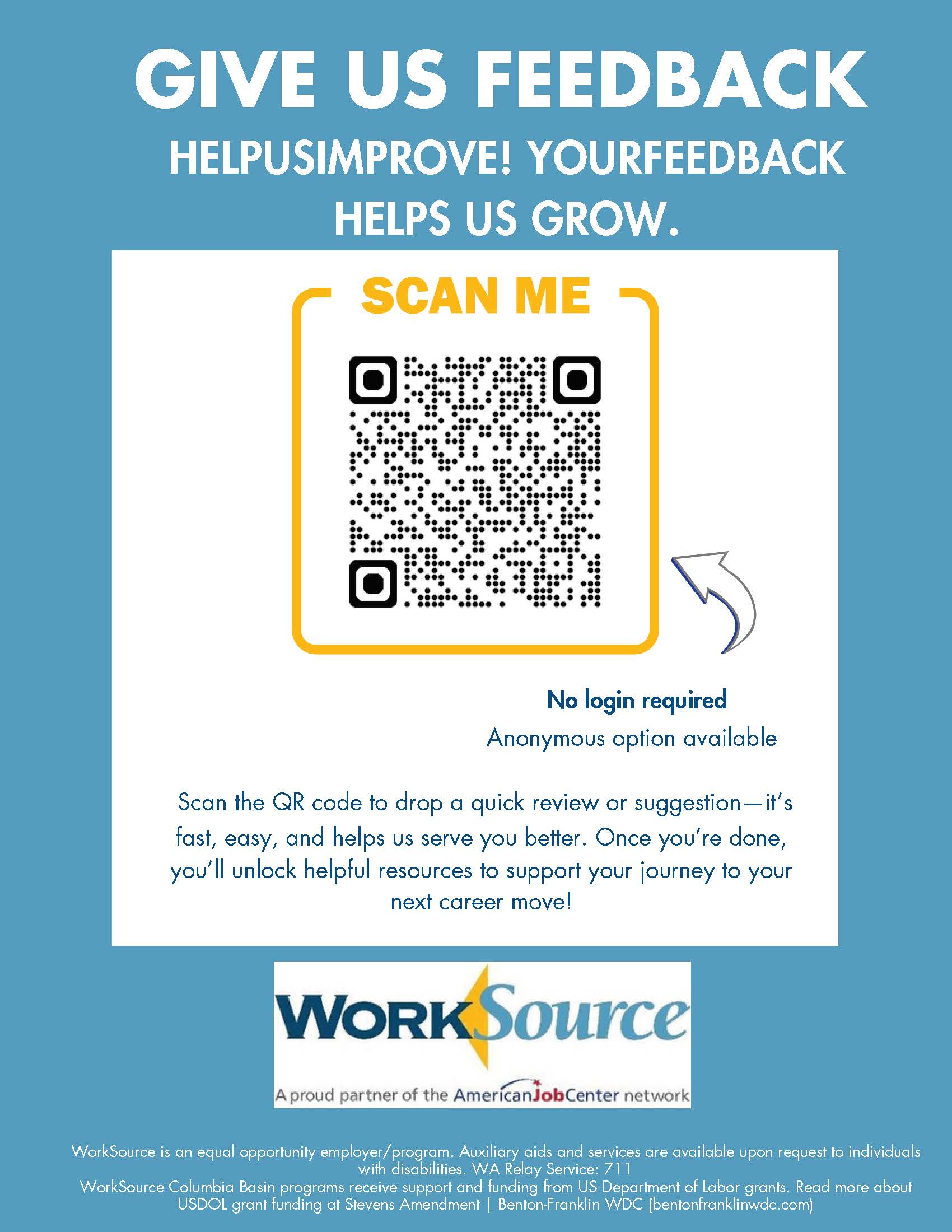 WorkSource and the Benton-Franklin Workforce Development Council are an equal opportunity employer/program. Auxiliary aids and services are available upon request to individuals with disabilities. Washington Relay 711.