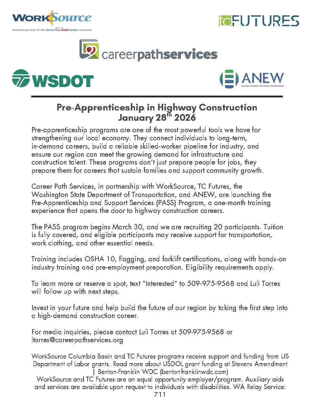 Career Path Services, in partnership with WorkSource, TC Futures, the Washington State Department of Transportation, and ANEW, are launching thePre‑Apprenticeship and Support Services (PASS) Program, a one‑month training experience that opens the door to highway construction careers.