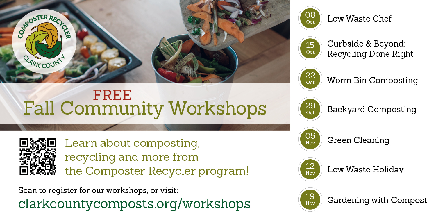 Pre-registration is required for all workshops. To register, visit the Composter Recycler website at clarkcountycomposts.org/classes-and-workshops/current-offerings. Registrants will receive a confirmation email after successful registration. Recordings of previous workshops are also available on the Composter Recycler website.