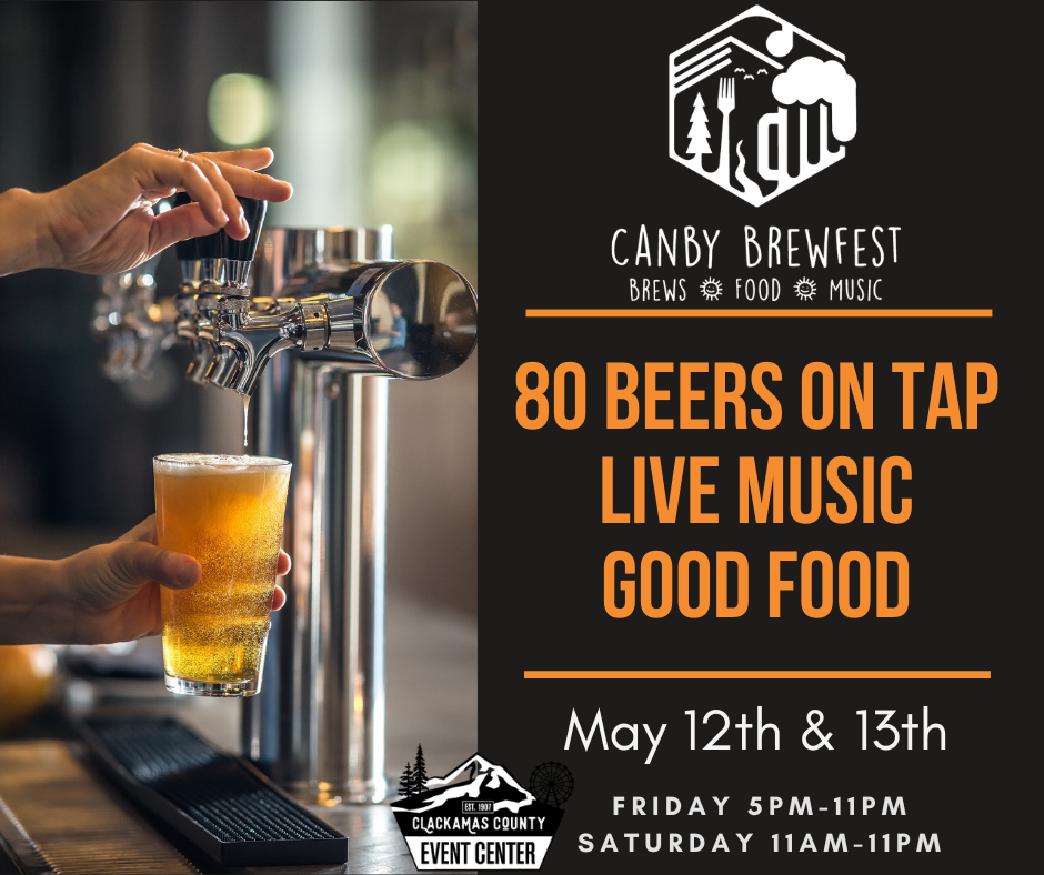 The Canby Brewfest will be located inside the Main pavilion building and will feature over 80 brews including beer, cider, wines, and seltzers and will be held Friday, May 12th, 5pm – 11pm and May 13th, 11am – 11pm.