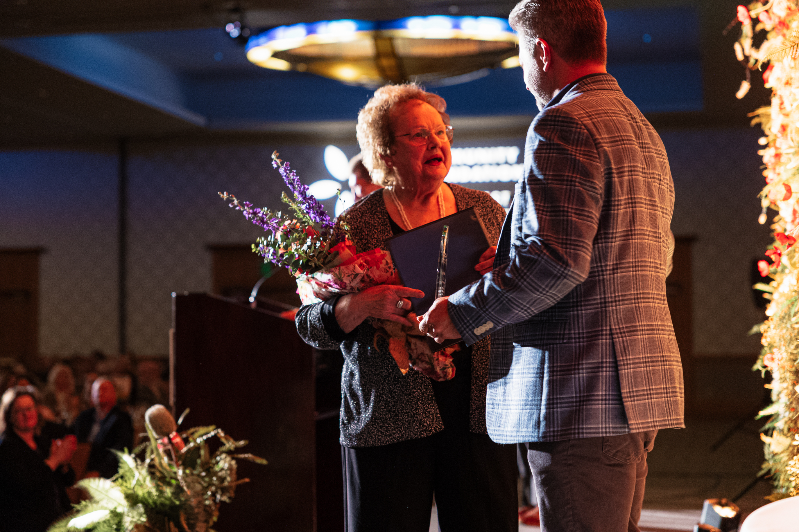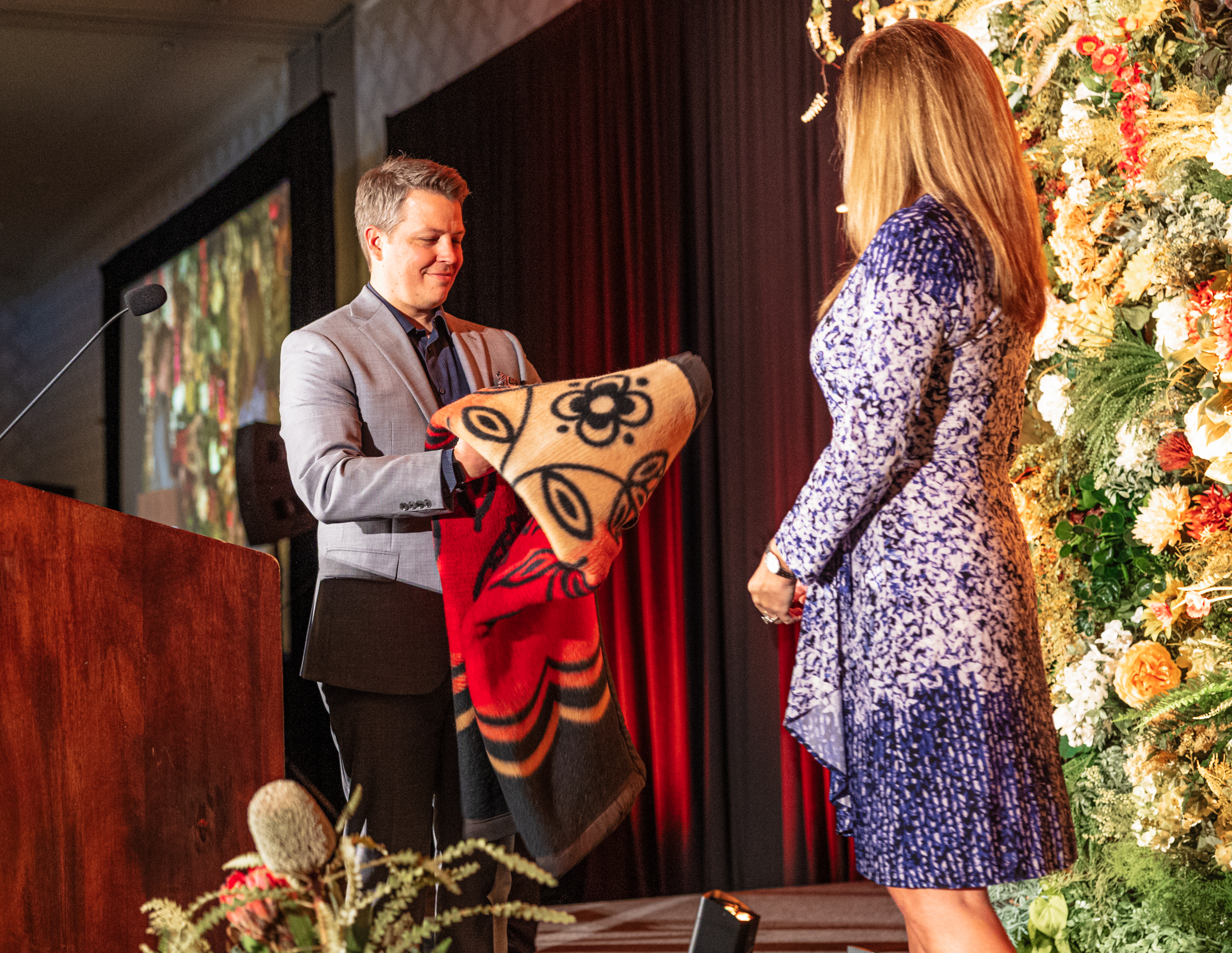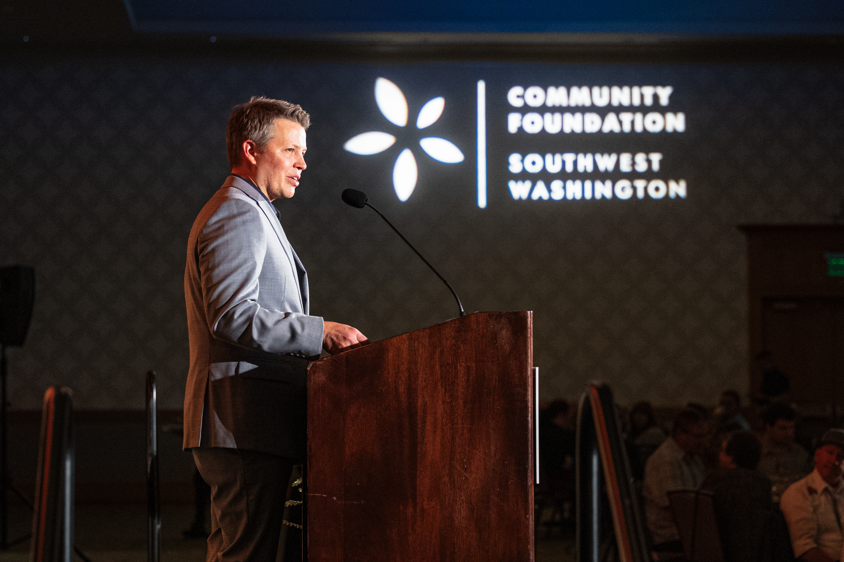 The event kicked off with former president Jennifer Rhoads saying farewell to the organization she served for nine years. In that time, the organization and its supporters granted more than $100 million to nonprofits and increased charitable assets at the Community Foundation five-fold. President Matt Morton then took to the podium and honored Rhoads’ contributions by gifting her with a blanket, a custom he draws upon as a member of the Squaxin Island Tribe to mark major events.