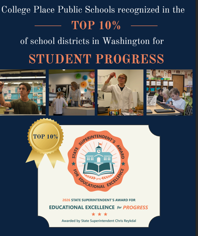 College Place Public Schools has been recognized by the Washington Office of Superintendent of Public Instruction (OSPI) with the inaugural State Superintendent’s Award for Educational Excellence in Student Progress. This recognition places College Place among the top 10% of school districts in Washington for improvement in student progress over the past three years.