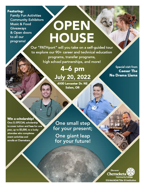 Open House visitors in attendance can complete a PATHport activity, which is a self-guided tour to explore the Chemeketa campus and programs. The grand prize $5,000 scholarship that will be awarded will help cover tuition and fees for one year to a lucky attendee who completes the PATHport activity and enrolls at Chemeketa for the fall 2022, winter 2023, and spring 2023 academic terms.
