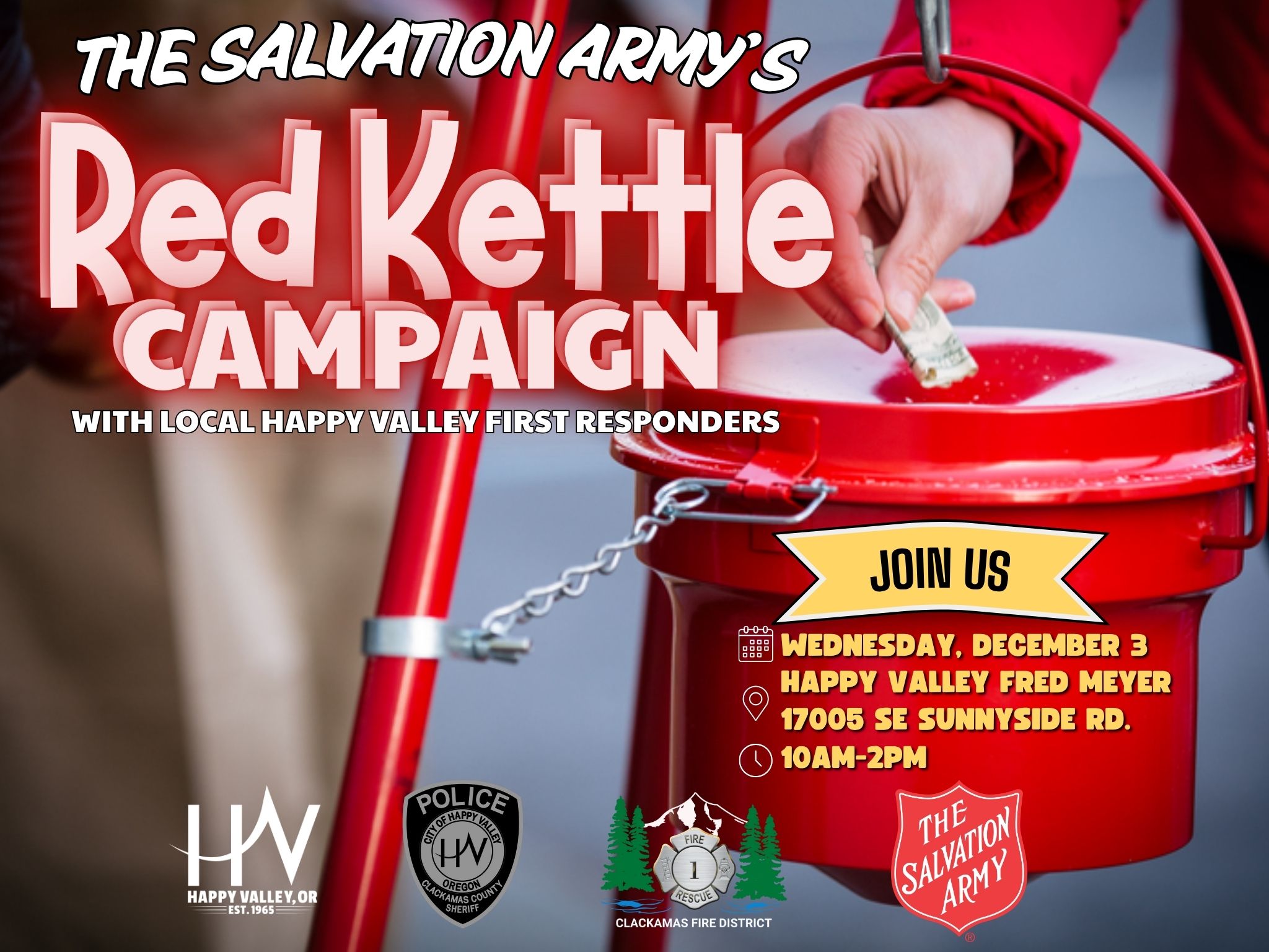 Get ready to spread some holiday cheer and meet your local heroes! On Wednesday, December 3rd, from 10 AM to 2 PM at Fred Meyer in Happy Valley (17005 SE Sunnyside Rd.), the community is invited to join forces with the Happy Valley Police Department and Clackamas Fire District as well as our civic leaders for the Salvation Army Red Kettle Donation Drive.