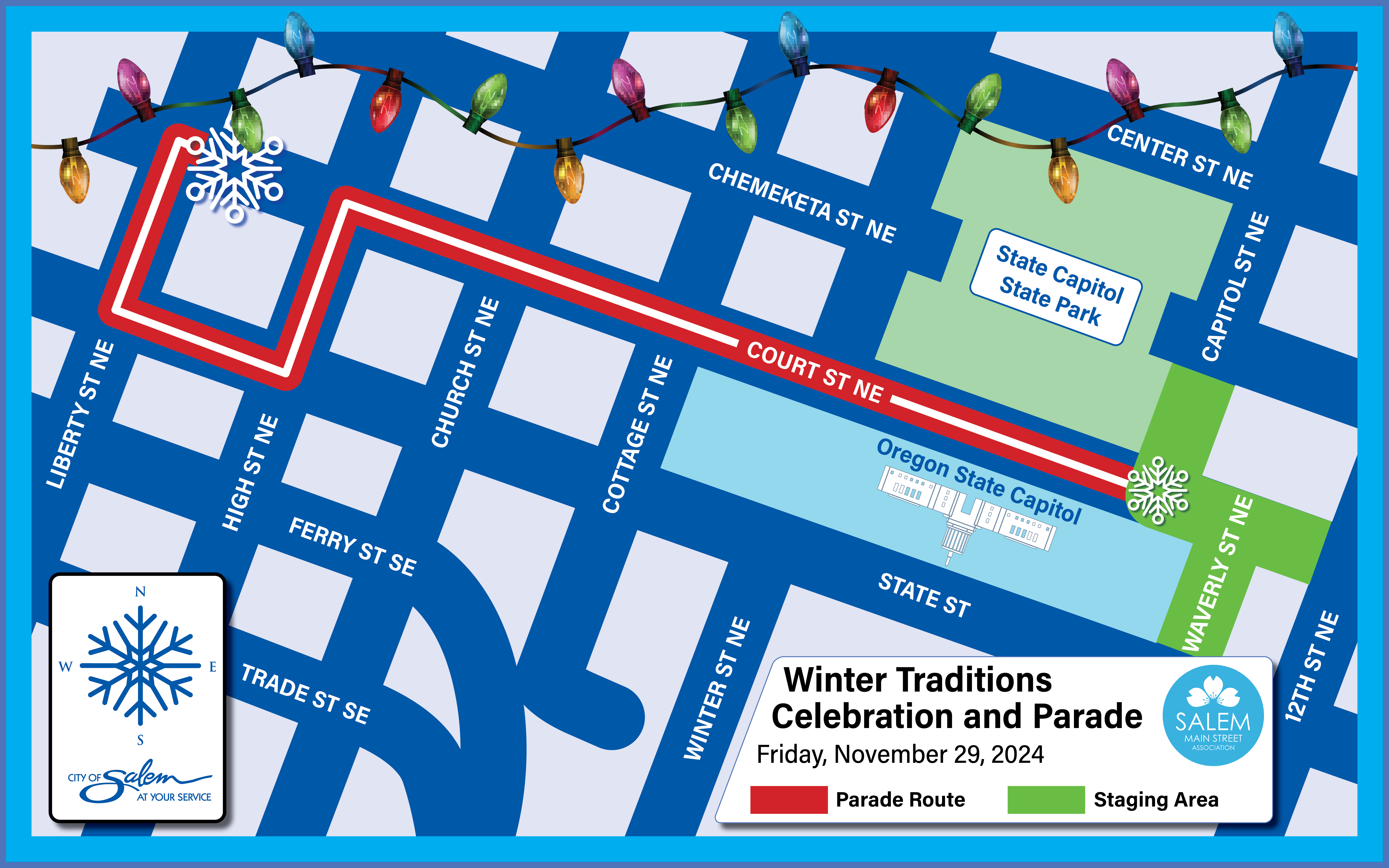 The parade route will begin on Court Street NE, east of the Oregon State Capitol, and wind through downtown, on High Street (between State Street and Court Street), State Street (between High Street and Liberty), and will end at Liberty and Court Street. A detailed map of the route is available online.