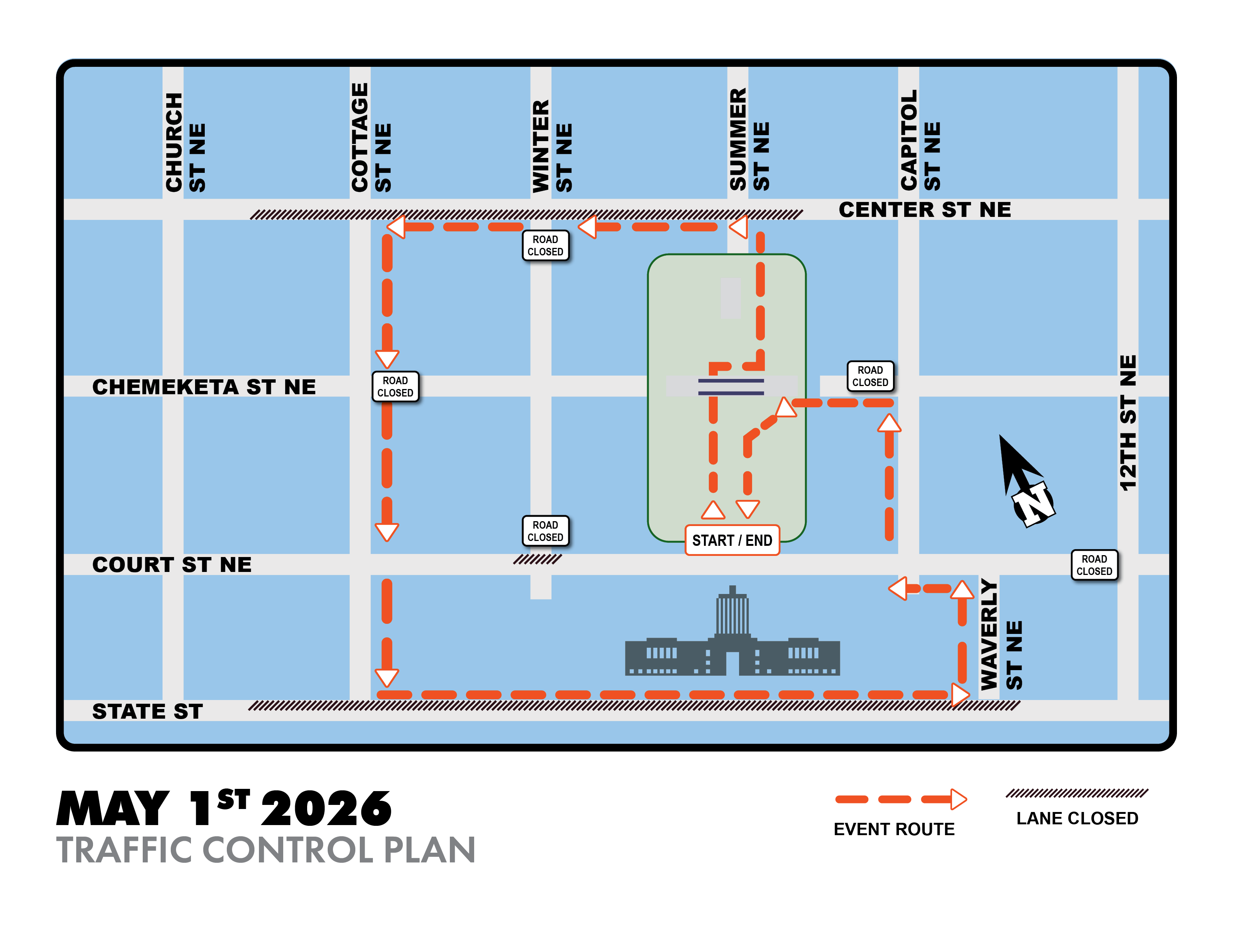 Salem, Ore. — Street closures are planned related to a one-day event Friday, May 1, near the Oregon State Capitol Mall. Permitted street closures for the event will include portions of State Street NE and Center Street NE between Cottage Street NE and 12th Street NE, and Church Street NE between Center and State streets. The closures will be in effect from 12:30-3 p.m.