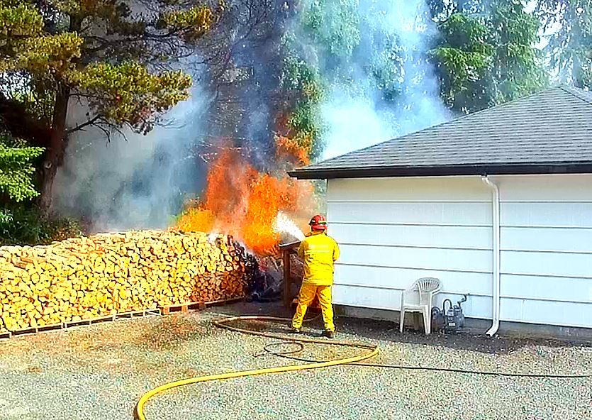 SEASIDE, Ore. – June 28, 2023 – At 4:42 p.m. on Tuesday, June 27, a member of Seaside Fire & Rescue noticed smoke in the air above the south end of Seaside, east of Highway 101. Upon investigation, the smoke was revealed to be coming from an active fire in a large pile of wood next to a garage in the 86000 block of S. Wahanna Road. The flames extended along the siding of the garage and into the surrounding trees.
