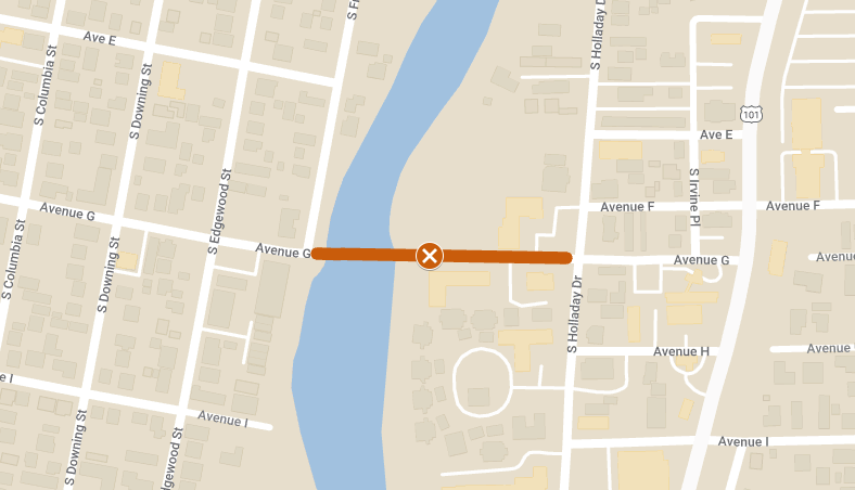 July 21, 2023 Update: Avenue G between S. Holladay and S. Franklin streets, including the bridge, will remain closed to all traffic through approximately August 9. The estimated closure has been extended an additional two weeks to accommodate a site review by the Oregon Department of Transportation. The required review will ensure further excavations do not affect the bridge foundations due to local site conditions.