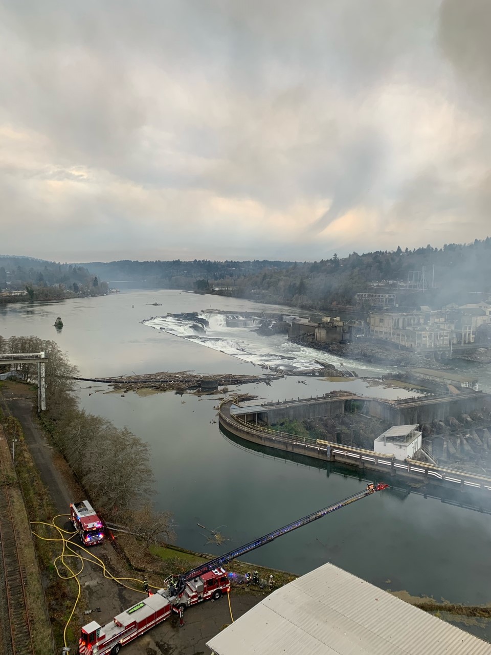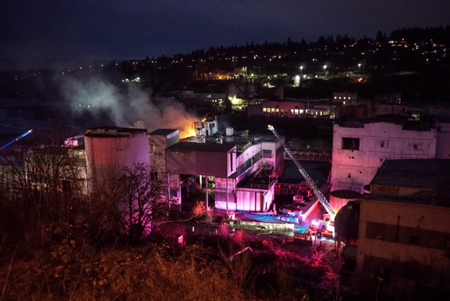 At 2:06 p.m. Firefighters were called to the abandoned Blue Heron Paper Mill located at 419 Main Street in Oregon City for a report of a fire in a building. First arriving crews reported heavy black smoke from a large abandoned commercial building, at the south end of the mill property and went to work to locate the fire, ventilate the structure and attempt to search the building. The fire was quickly upgraded to a second and third alarm, bringing in additional firefighting resources.