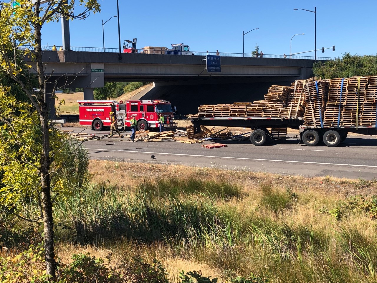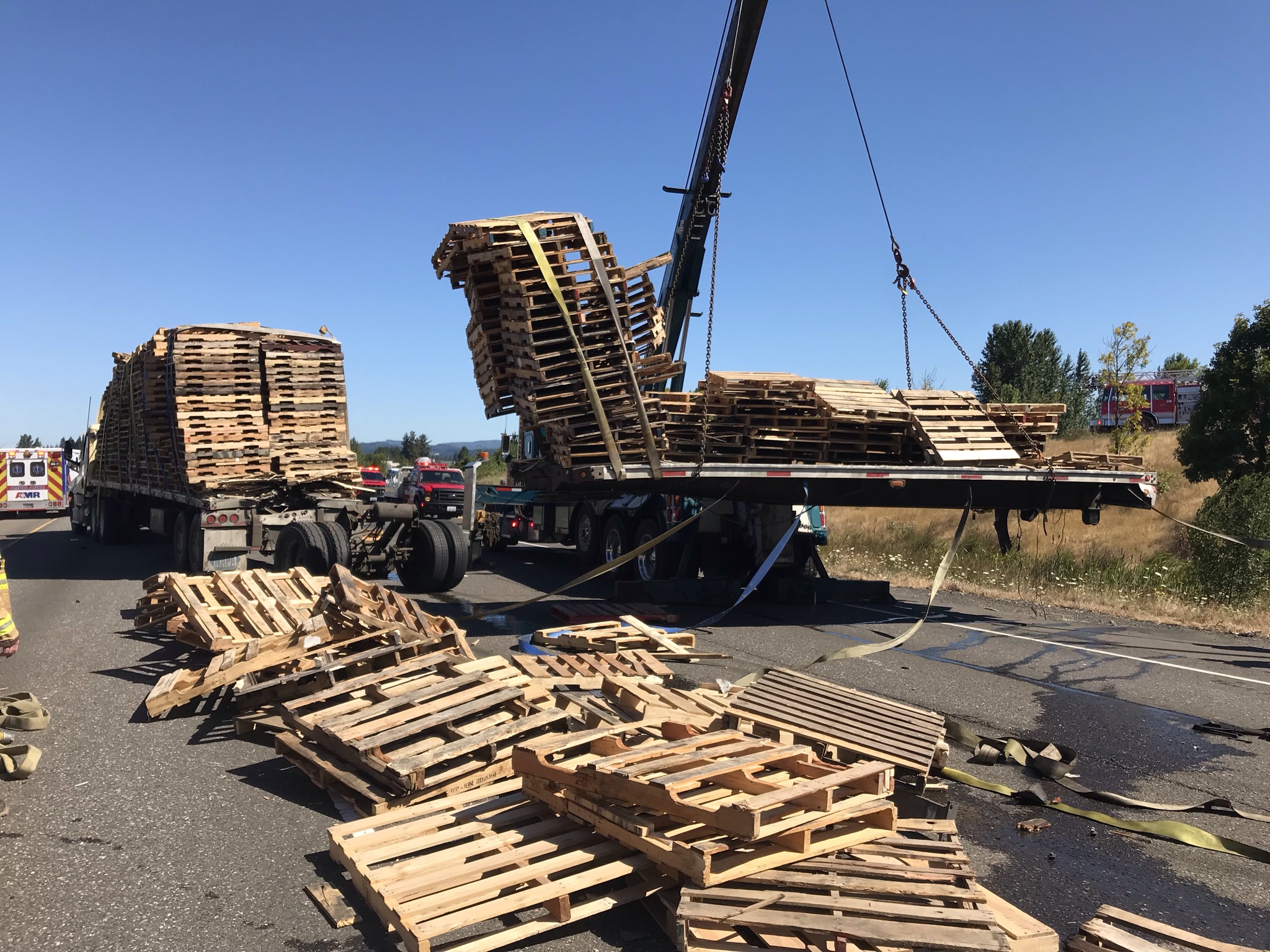Clark-Cowlitz Fire Rescue responded with AMR and Washington State Patrol to a collision near MP 20 at the north bound I-5 bridge over the North Fork of the Lewis River. The Collision involved a pickup truck and travel trailer that collided with a tractor trailer and stopped north-bound traffic on the interstate. No injuries were reported and no people were transported from the first collision. The collision near mile post 20 was dispatched at 0846 on Monday morning and CCFR responded with 1 engine, 1 tower ladder, and 1 Chief Officer. At 0956 a subsequent collision in the back-up from the first incident was dispatched at Exit 14 in Ridgefield, under the Pioneer Street Overpass. The second collision involved 2 tractor trailers, with one truck carrying a load of pallets, leaving the roadway and catching fire. The Fire Spread to both vehicles and one driver was transported to the hospital by AMR with non-life threatening injuries. The fire was quickly controlled by fire crews with the majority of fire damage limited to one vehicle. CCFR responded with 2 engines, 1 tower ladder, 1 brush truck, 1 water tender, and 2 chief officers to the second collision. Ridgefield Police assisted the Washington State Patrol on scene and TLC Towing cleared the vehicles and debris.