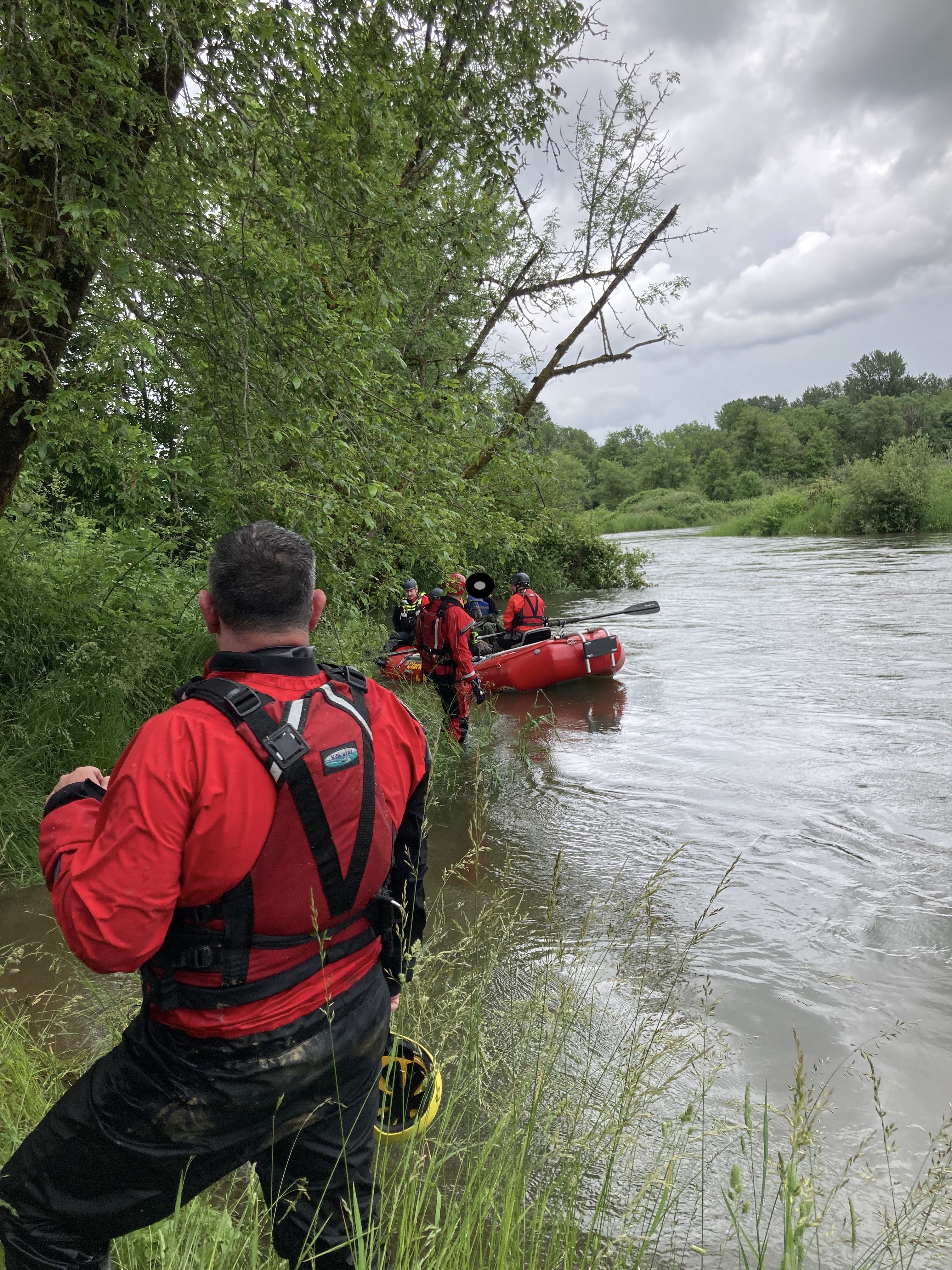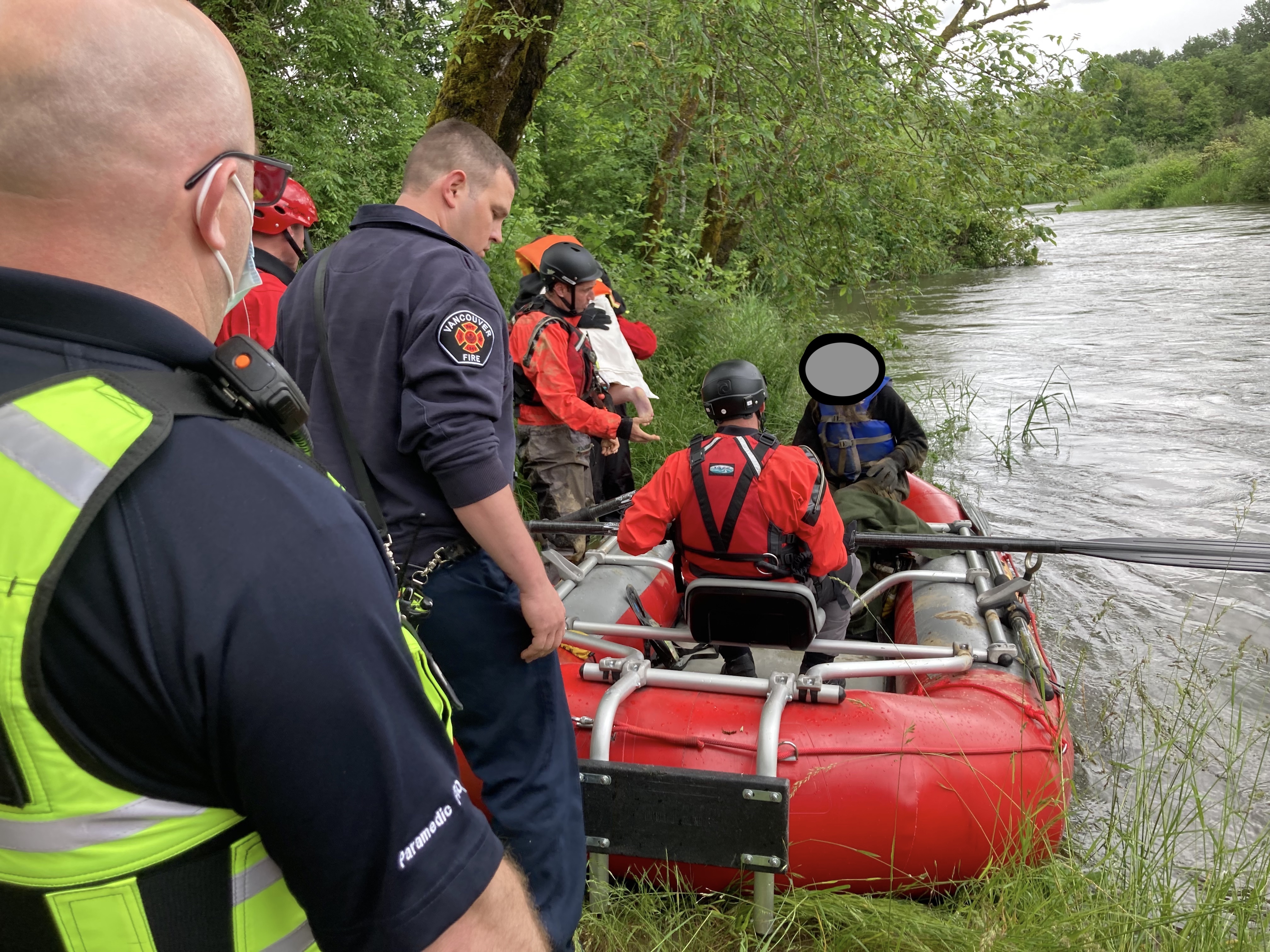 Rescue swimmers from Tower 21 and Engine 15-1 made access to the water and conducted a waterside search of the river. Technical Rescue Team members from the Vancouver Fire Department and Clark County Fire District 6 arrived on the scene and launched Raft 5 alongside Raft 23 for continued search.