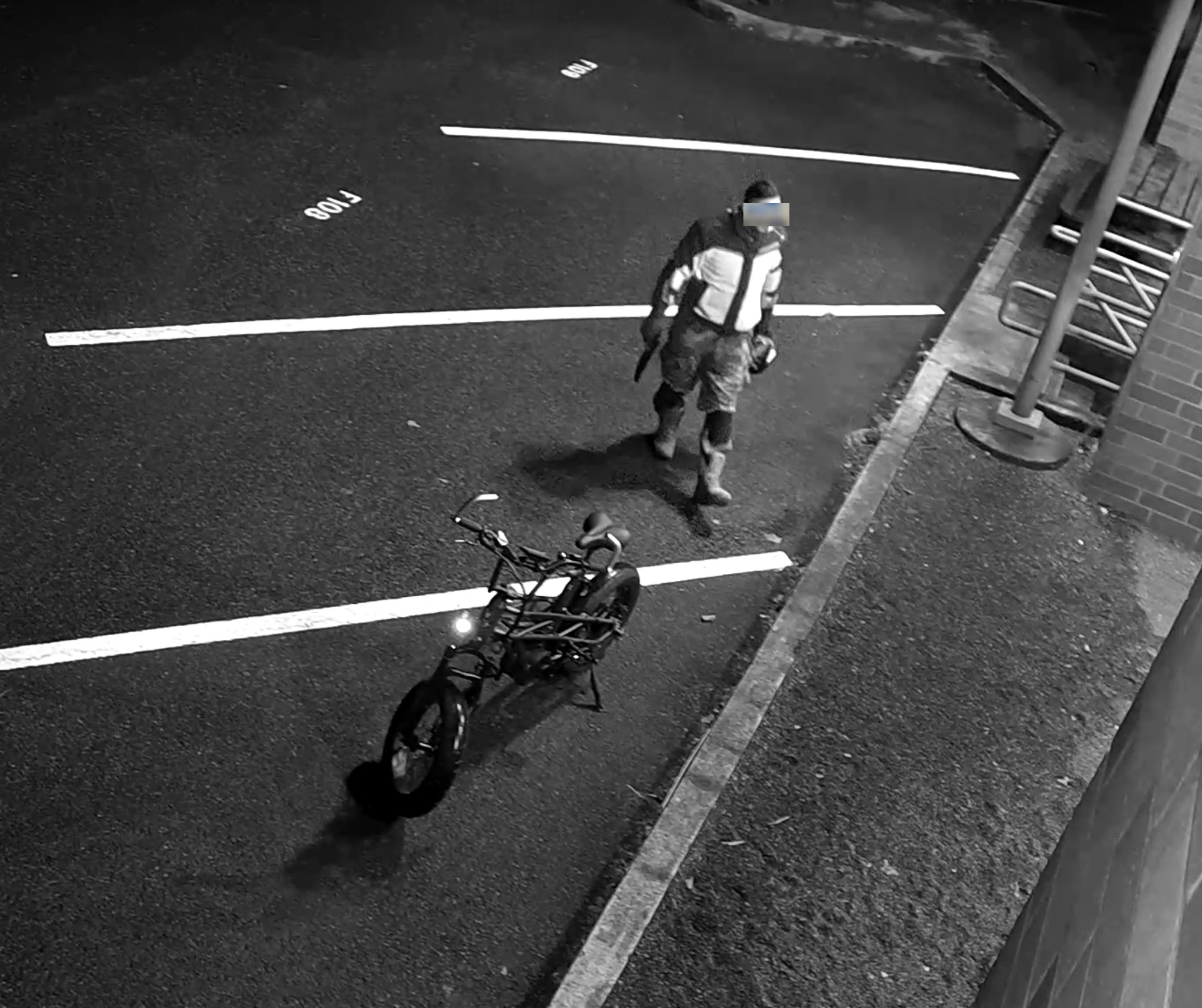 The subject, dressed in camo pants and a motorcycle jacket, remained on the county campus briefly before donning a motorcycle helmet, and mounting an electric bicycle with the gun against his head.