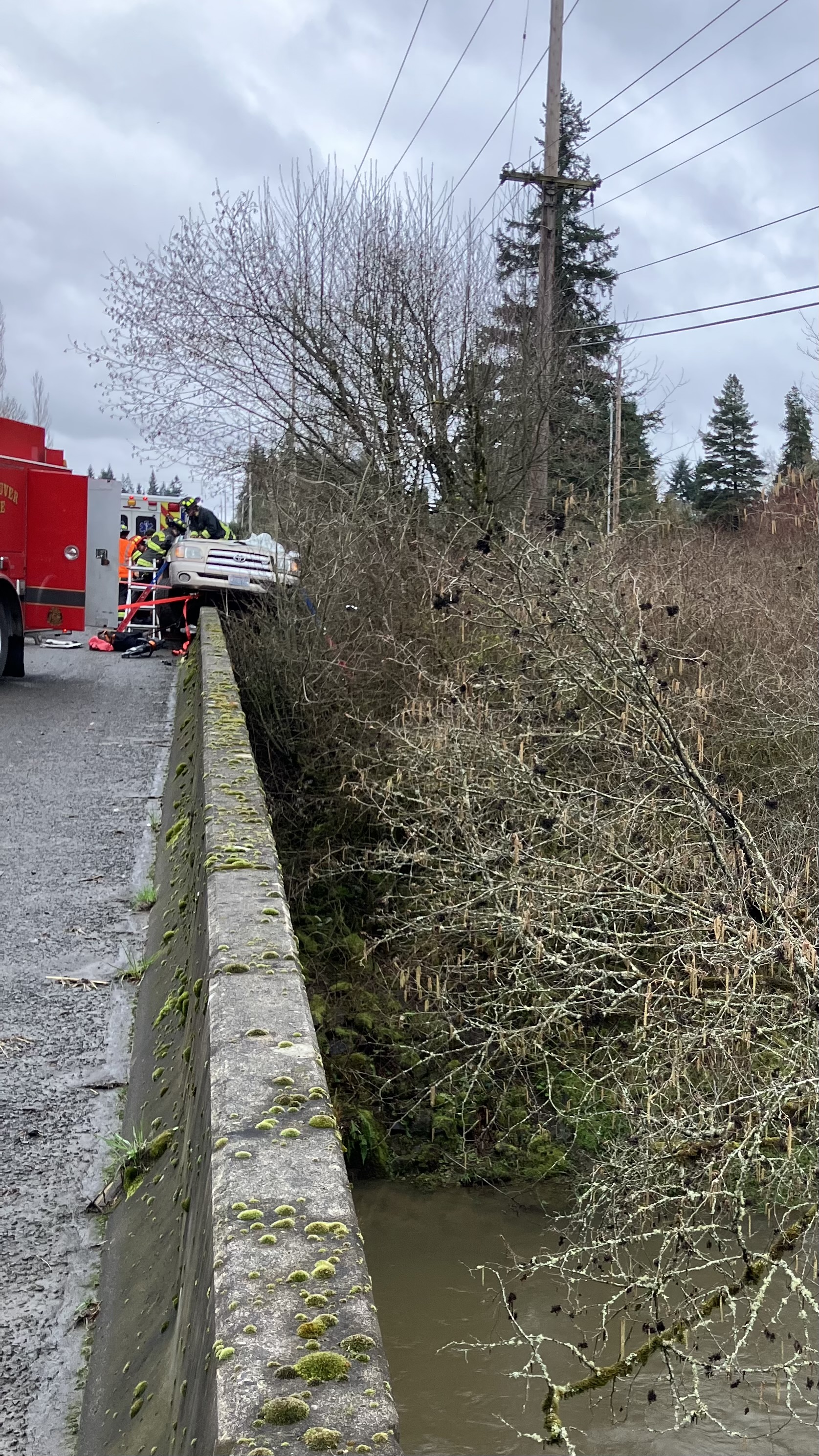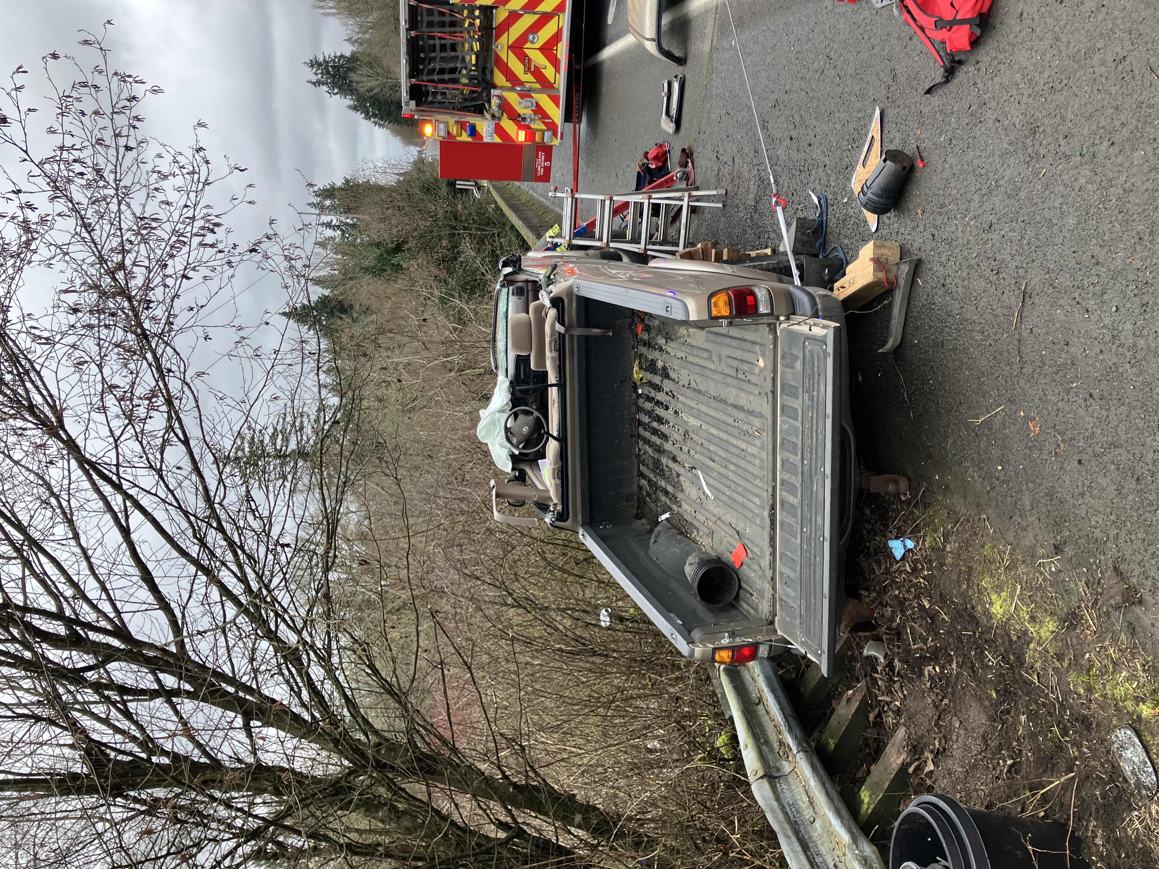 A pickup truck traveling northbound on NE 72nd Avenue veered across the oncoming lane of travel and struck a guardrail before high-centering on a Jersey barrier. The barrier narrowly prevented the vehicle from falling several feet into Salmon Creek below.