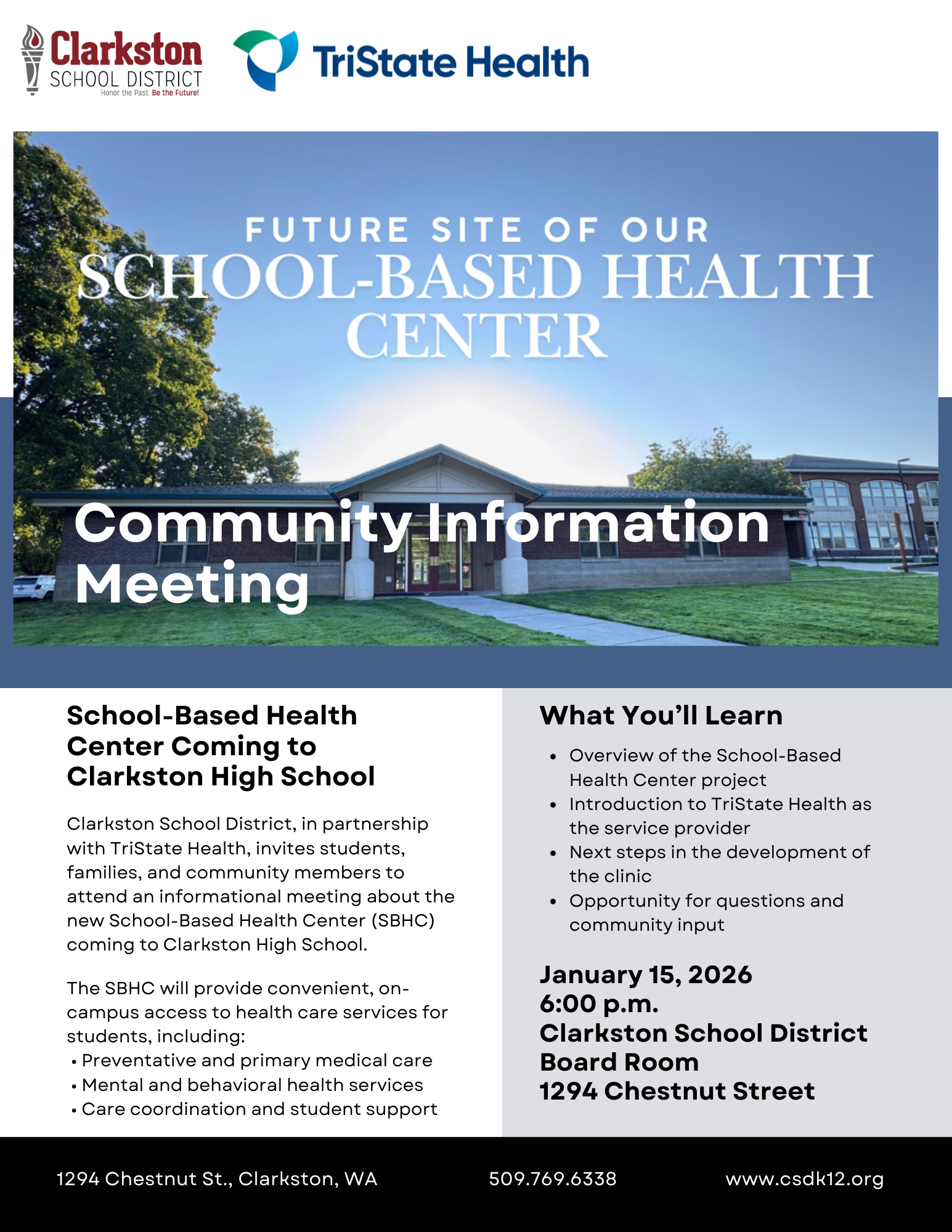 Clarkston, WA — Clarkston School District and TriState Health will host a community information meeting on Thursday, January 15, 2026, at 6:00 p.m. in the Clarkston School District Board Room (1294 Chestnut Street) to share details about the new School-Based Health Center (SBHC) coming to Clarkston High School.