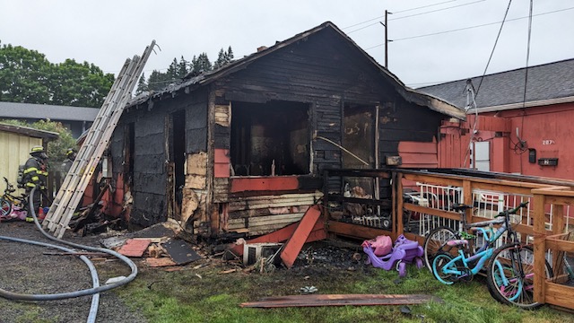 Kelso, WA – Firefighters from Cowlitz 2 Fire & Rescue and the City of Longview Fire Department responded to a house fire before 4:30 am in the 200 block of NW 7th Ave. Fire crews arrived and reported the home heavily involved in fire with nearby buildings and a trailer at risk of igniting and power lines down on the street. Firefighters attacked the fire and evacuated a total of 11 people, including 6 small children and a wheelchair-bound citizen from the home(s). Family pets were also all accounted for. Firefighters had the fire under control at 4:53 am. Cowlitz County Public Utility District also responded to the incident and secured power to the area. Kelso Police, an AMR medic unit, and a Cowlitz County Chaplin also responded. Cowlitz County Fire District 5 (Kalama) were contacted and covered other calls in Cowlitz 2 response area. Five engines, a ladder truck, and three Chief Officers were dispatched to the fire.