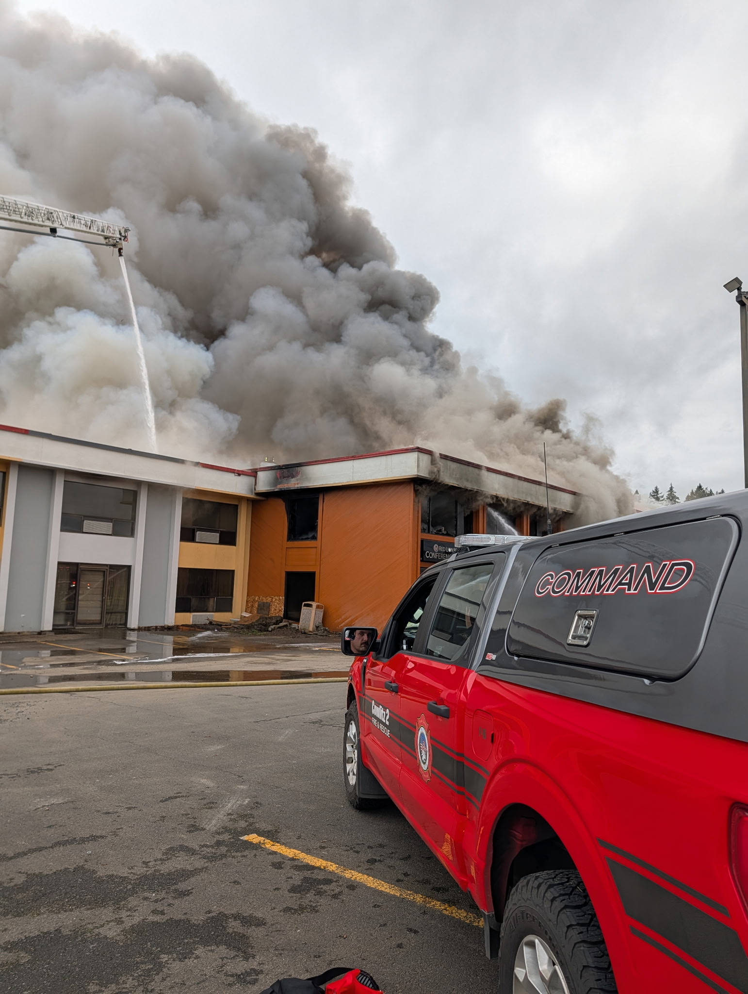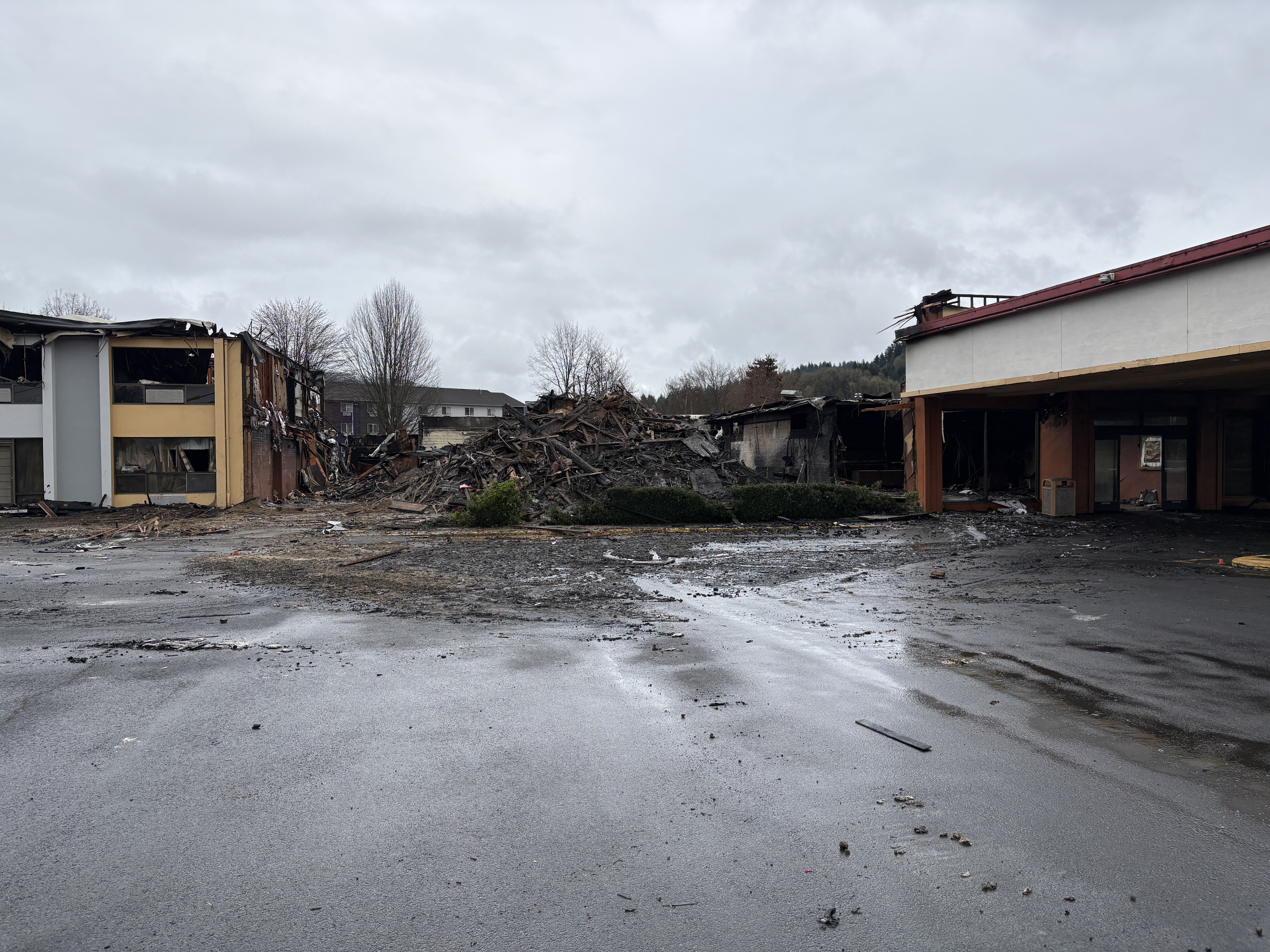 Today, Sunday, crews continued operations at the red line in Kelso. Crews worked overnight to monitor pockets of fire and to extinguish those as they developed. This morning, crews arrived on site with heavy equipment, brought in by the property owners, and in conjunction with Cowlitz 2 Fire Rescue & Rescue investigators and fire personnel began to remove the remaining building hazards (hanging debris and fall hazard equipment), allowing access to areas of interest in their investigation.