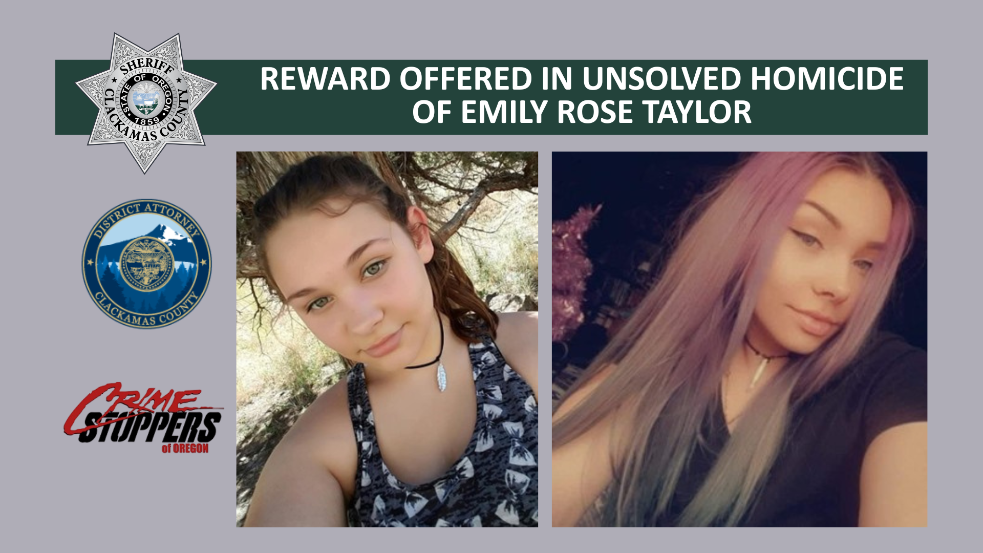 The Clackamas County Sheriff’s Office, in partnership with the Clackamas County District Attorney’s Office and Crime Stoppers of Oregon, is asking for the public’s help with information related to the murder of 19-year-old Emily Rose Taylor.