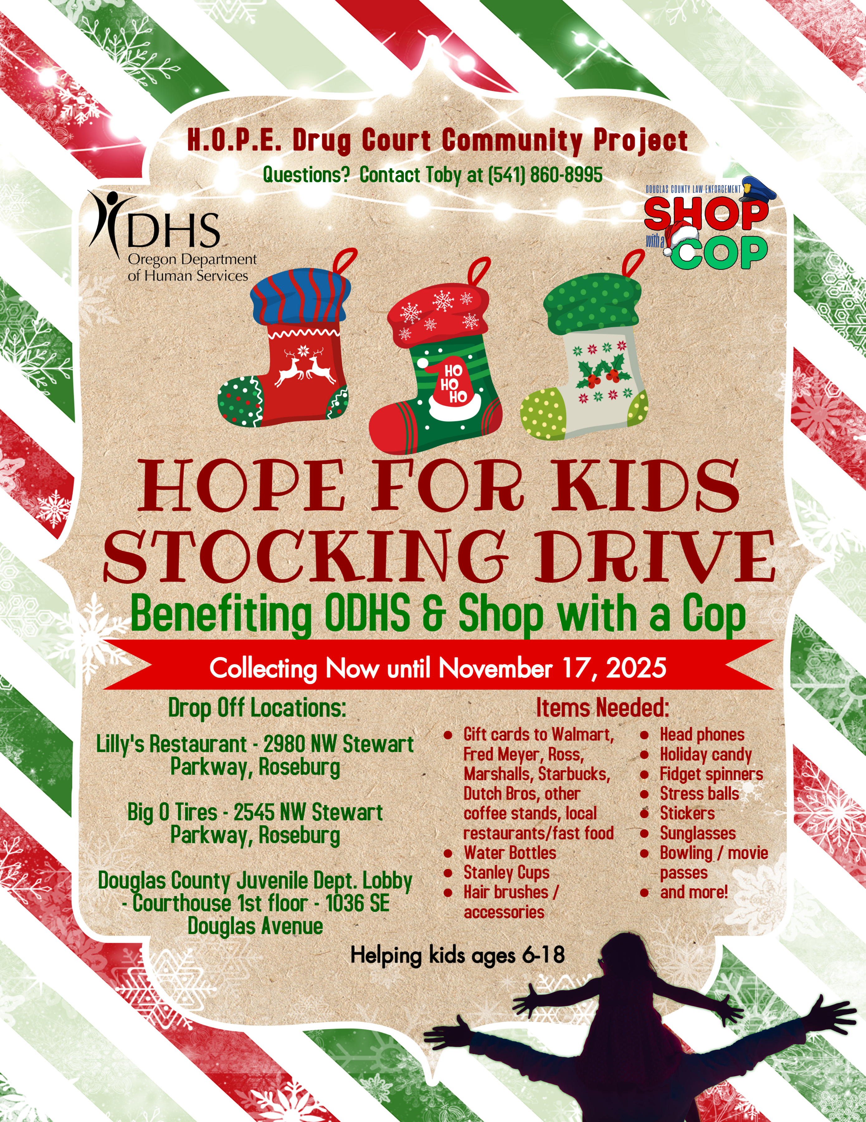 Roseburg, OR – October 9, 2025 – The Oregon Department of Human Services (ODHS) and the Shop with a Cop program are recipients this holiday season by a H.O.P.E. Drug Court participant working to make sure teens and young children in Douglas County feel the joy of Christmas morning. The community is invited to help by donating stocking items and teen-friendly gifts that will be provided to local youth in need.