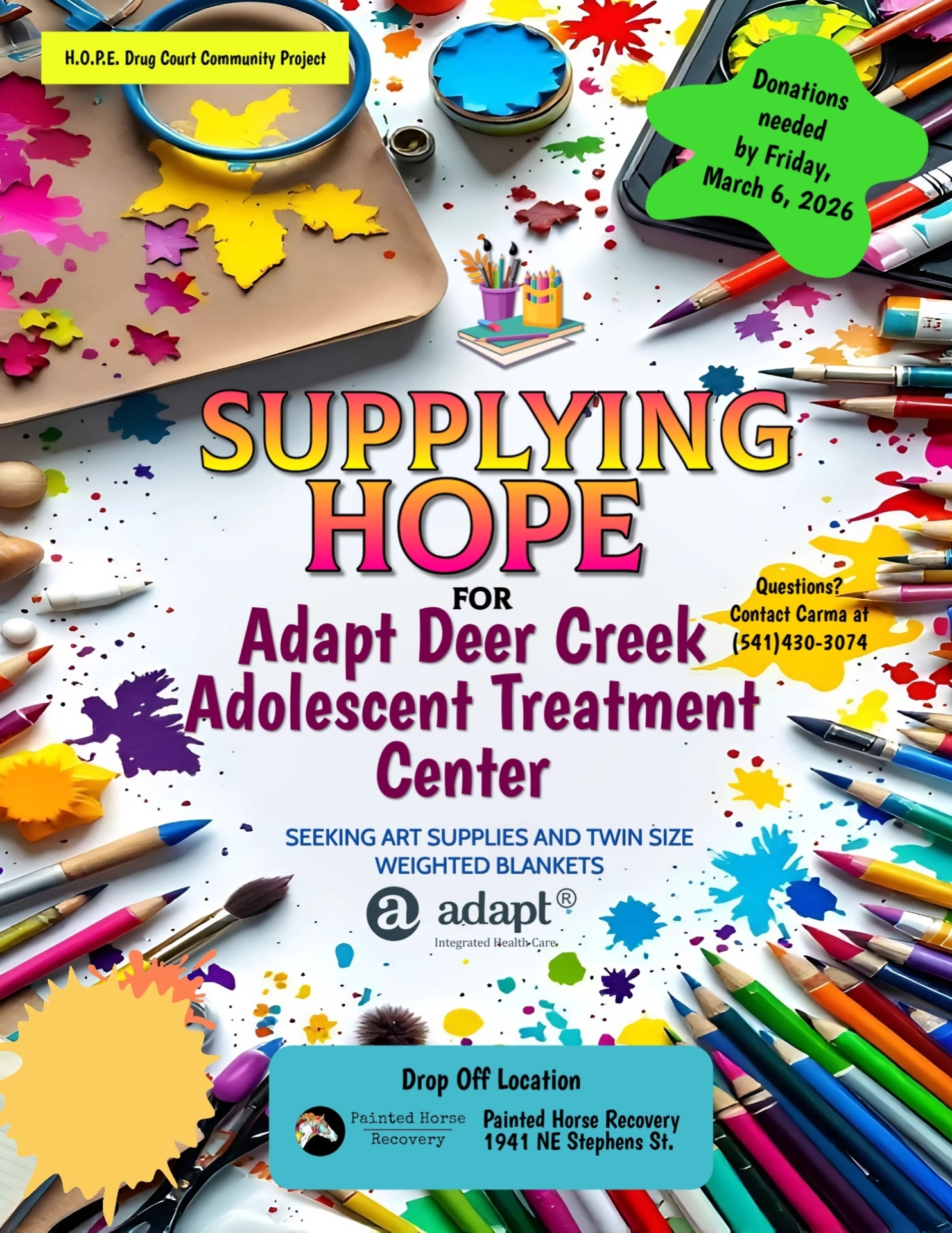 Roseburg, OR – February 12, 2026. A graduate-phase participant of the H.O.P.E. Drug Court program is leading a community donation drive to benefit youth served at Adapt’s Deer Creek Adolescent Treatment Center. The effort aims to collect specific art supplies and weighted blankets that support therapeutic programming and daily living needs for adolescents receiving treatment.