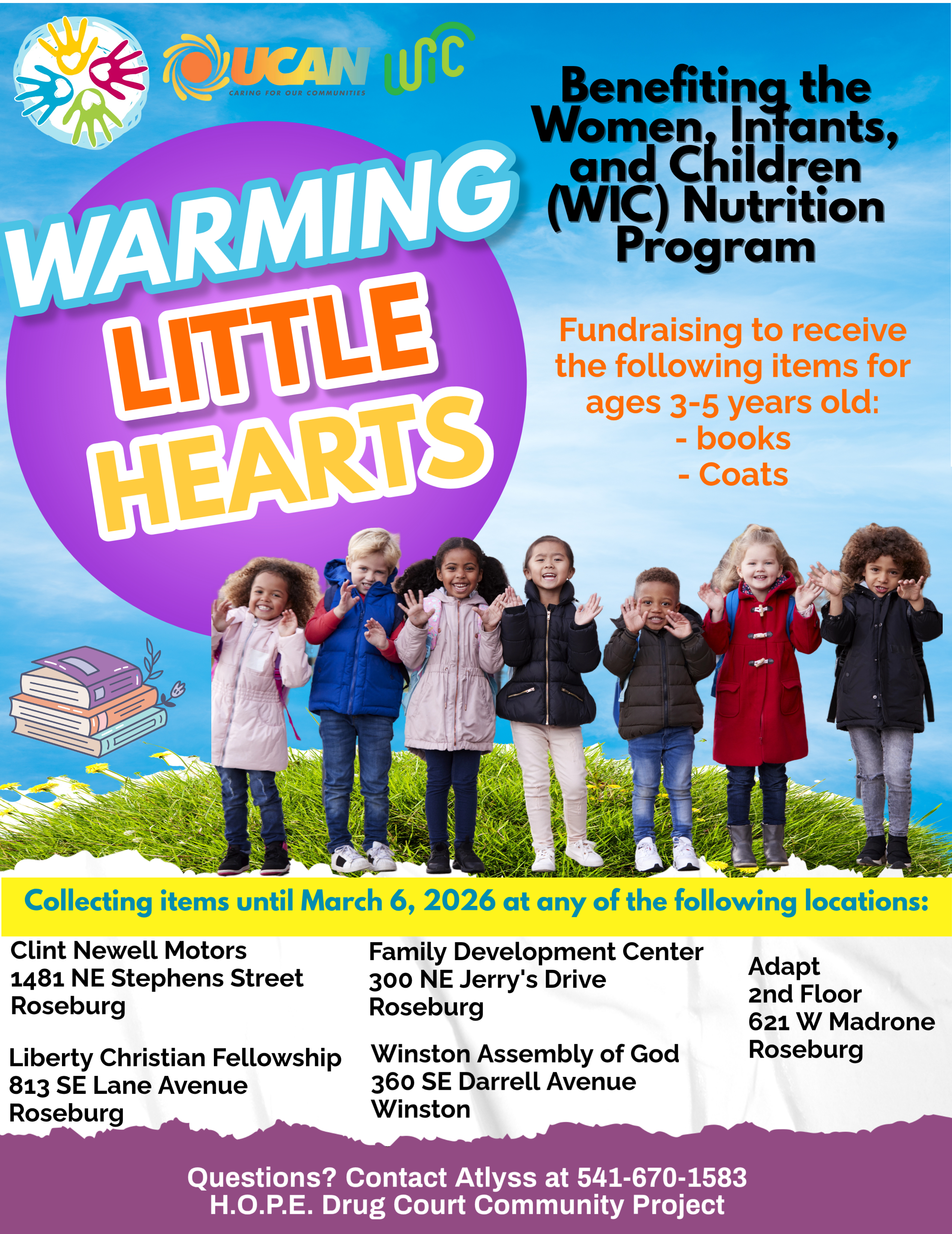 Roseburg, Oregon – February 12, 2026. A H.O.P.E. Drug Court participant has launched “Warming Little Hearts,” a community driven project dedicated to supporting families served by the local Women, Infants, and Children (WIC) program. This initiative is collecting new and gently used children’s books and coats for children ages 3 to 5.