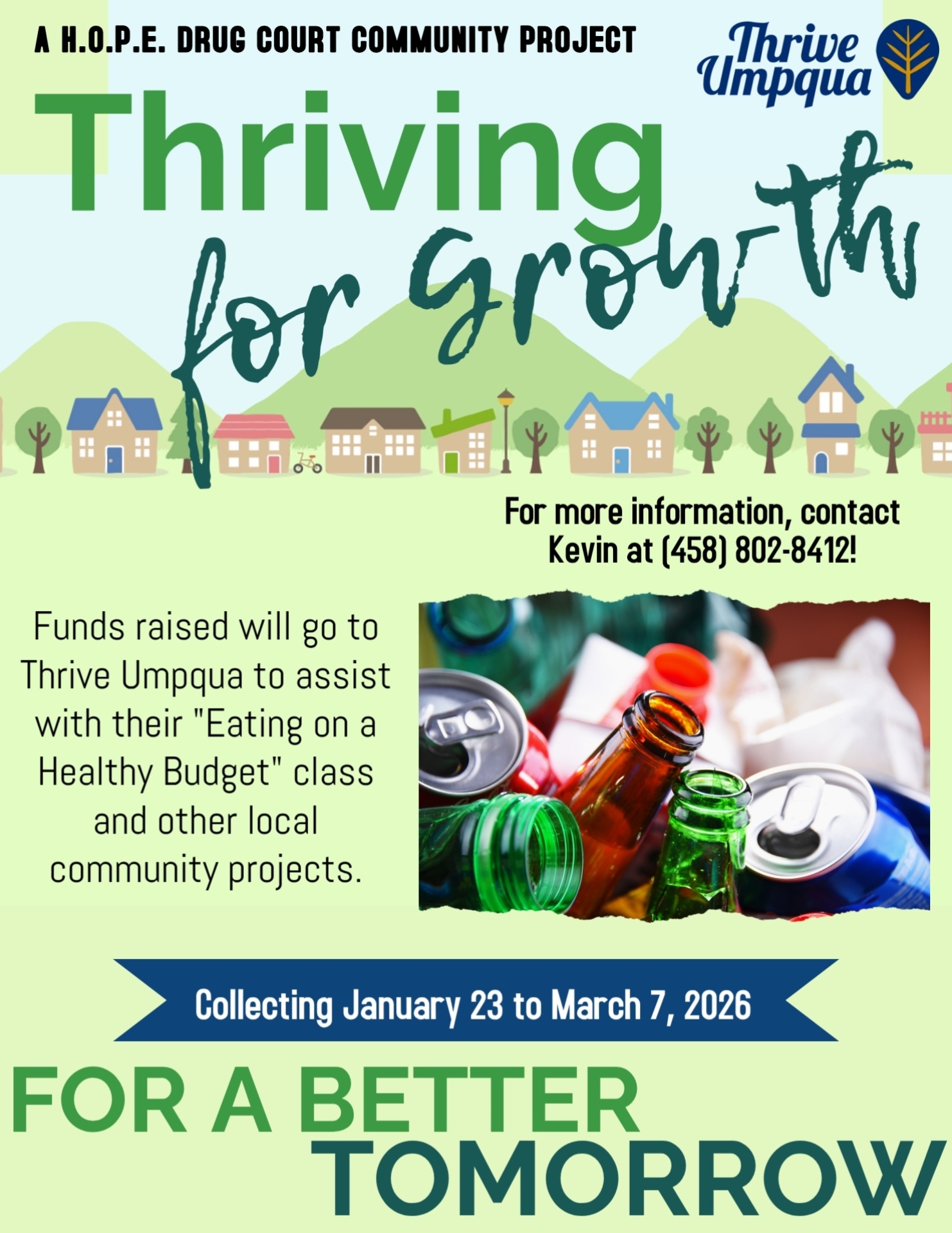 A third component of this project is to assist Thrive Umpqua with the cost of their monthly classes for Eating Healthy on a Budget to support individuals utilizing the Progress Point facility operated by Adapt Integrated Healthcare. This program focuses on practical skills for preparing nutritious, affordable meals and promoting long-term wellness. To help fund the class, a community can and bottle drive is currently underway, and monetary donations are also welcome to expand program resources and reach more participants in need.