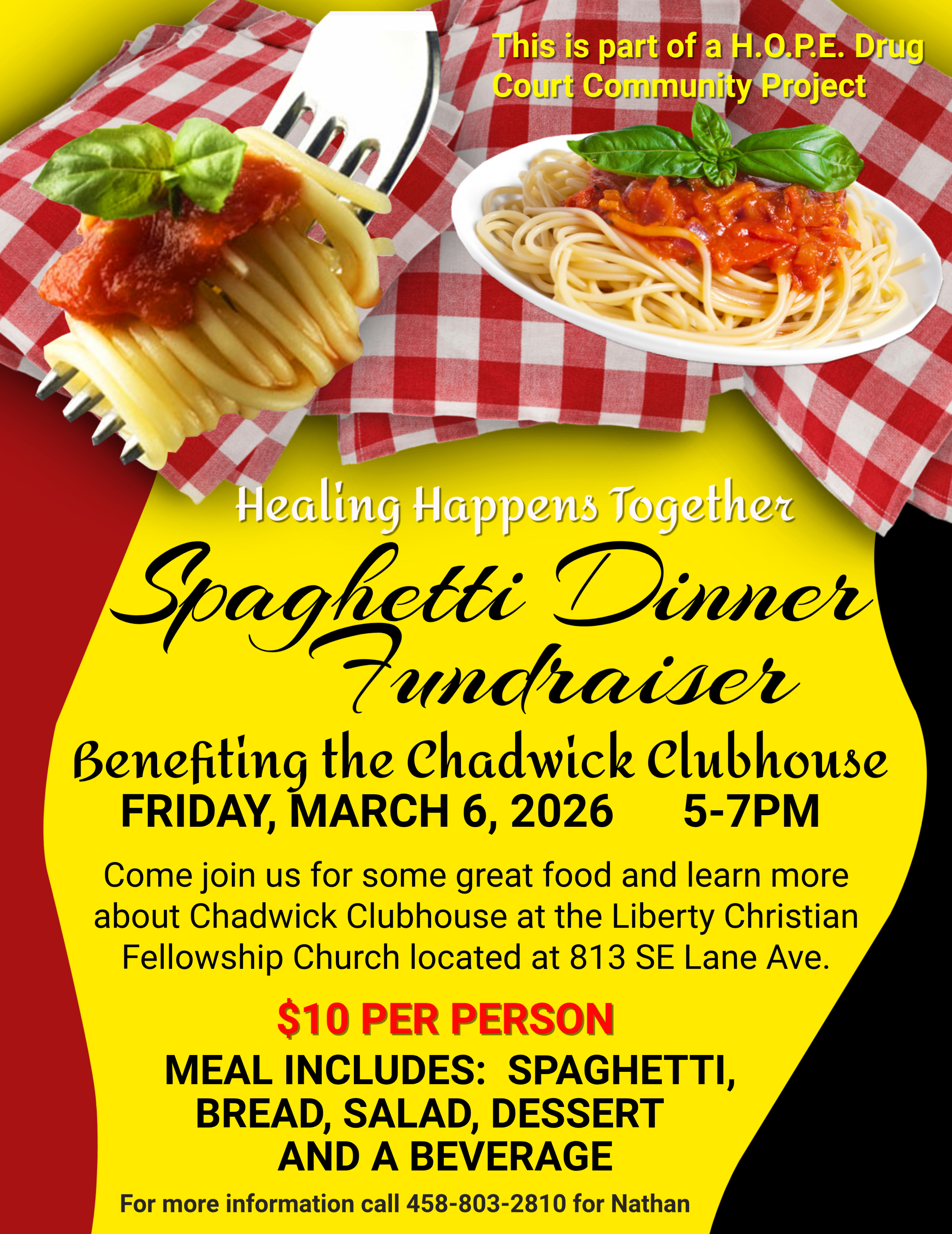 Nathan Sessions will host a community spaghetti feed fundraiser on Friday, March 6, from 5:00 to 7:00 p.m. at Liberty Christian Fellowship Church, located at 813 SE Lane Street. A free play will take place at 6:00 p.m. for those who would like to enjoy dinner followed by the performance.