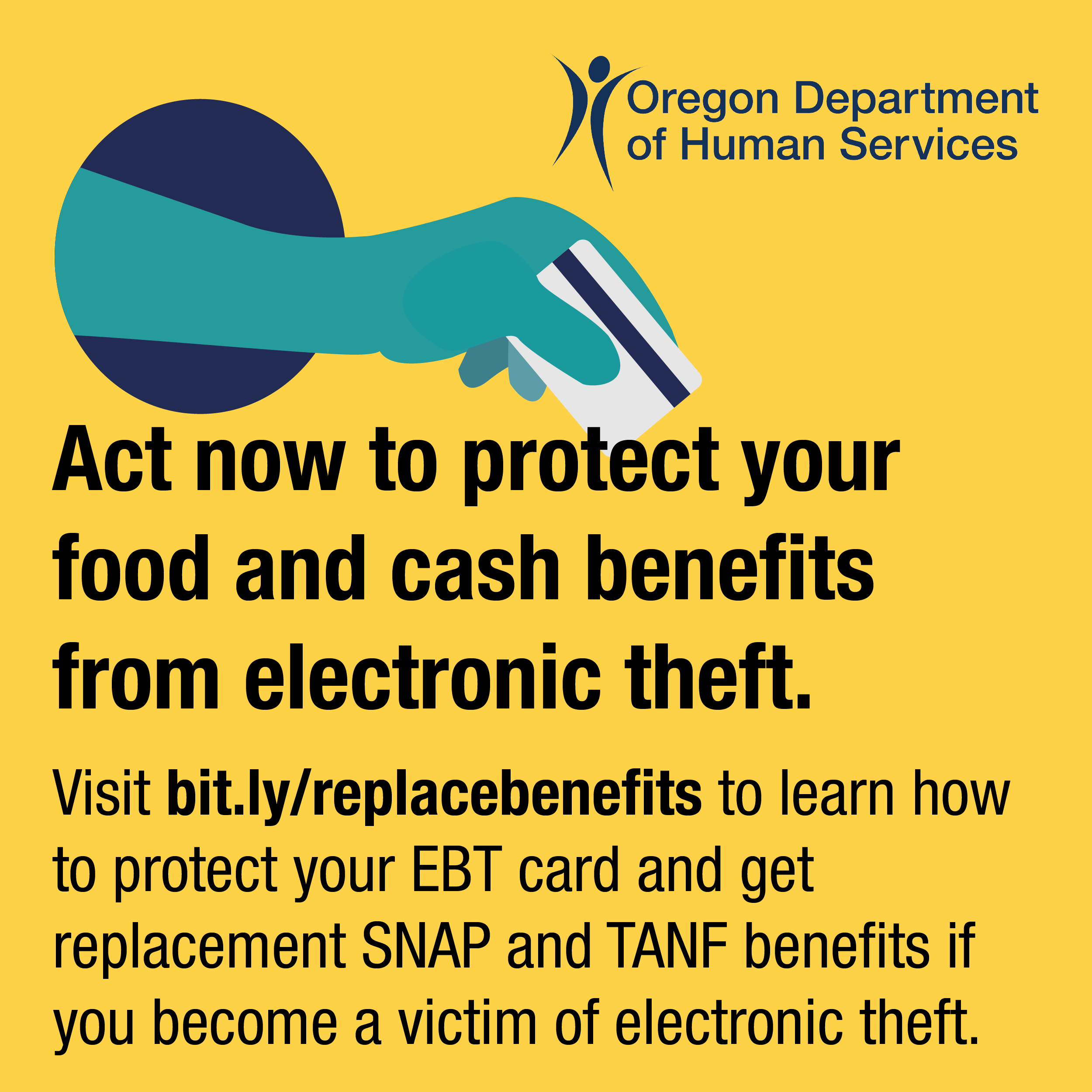 “We know that many individuals and families in Oregon rely on the food and cash assistance they receive through their EBT cards to meet their basic needs and to get enough healthy food for themselves and their families,” said Claire Seguin (she/her), director of the ODHS Self-Sufficiency Programs. “We urge everyone with an EBT card to take these simple steps to protect their benefits.”