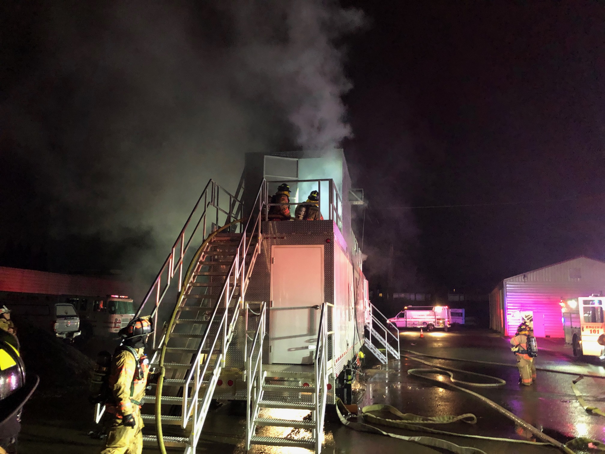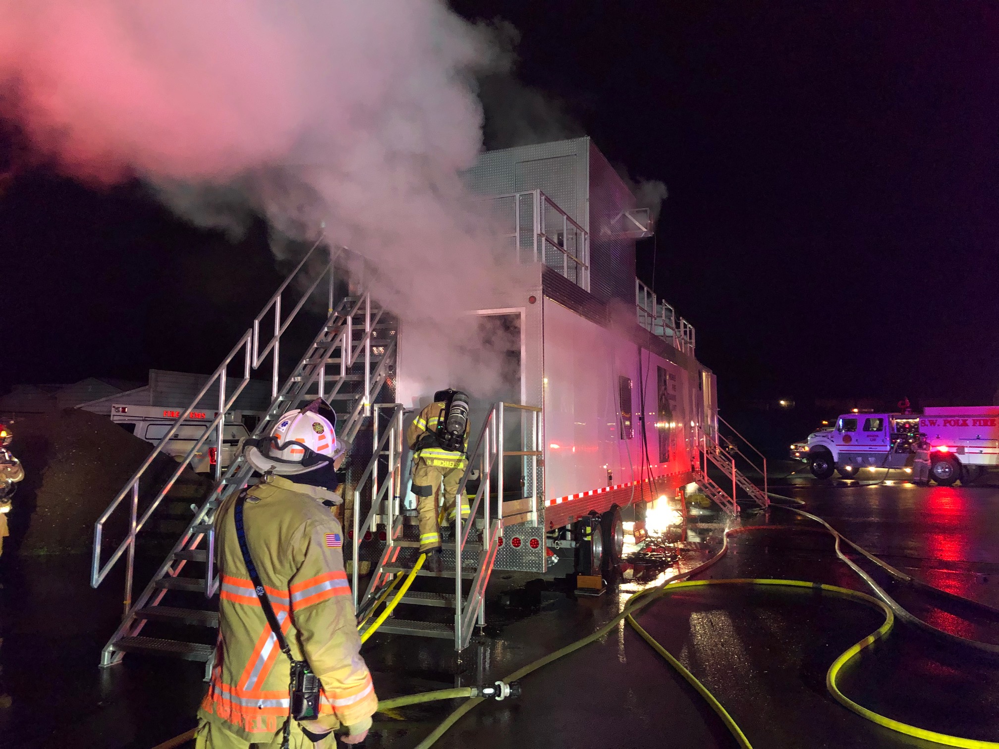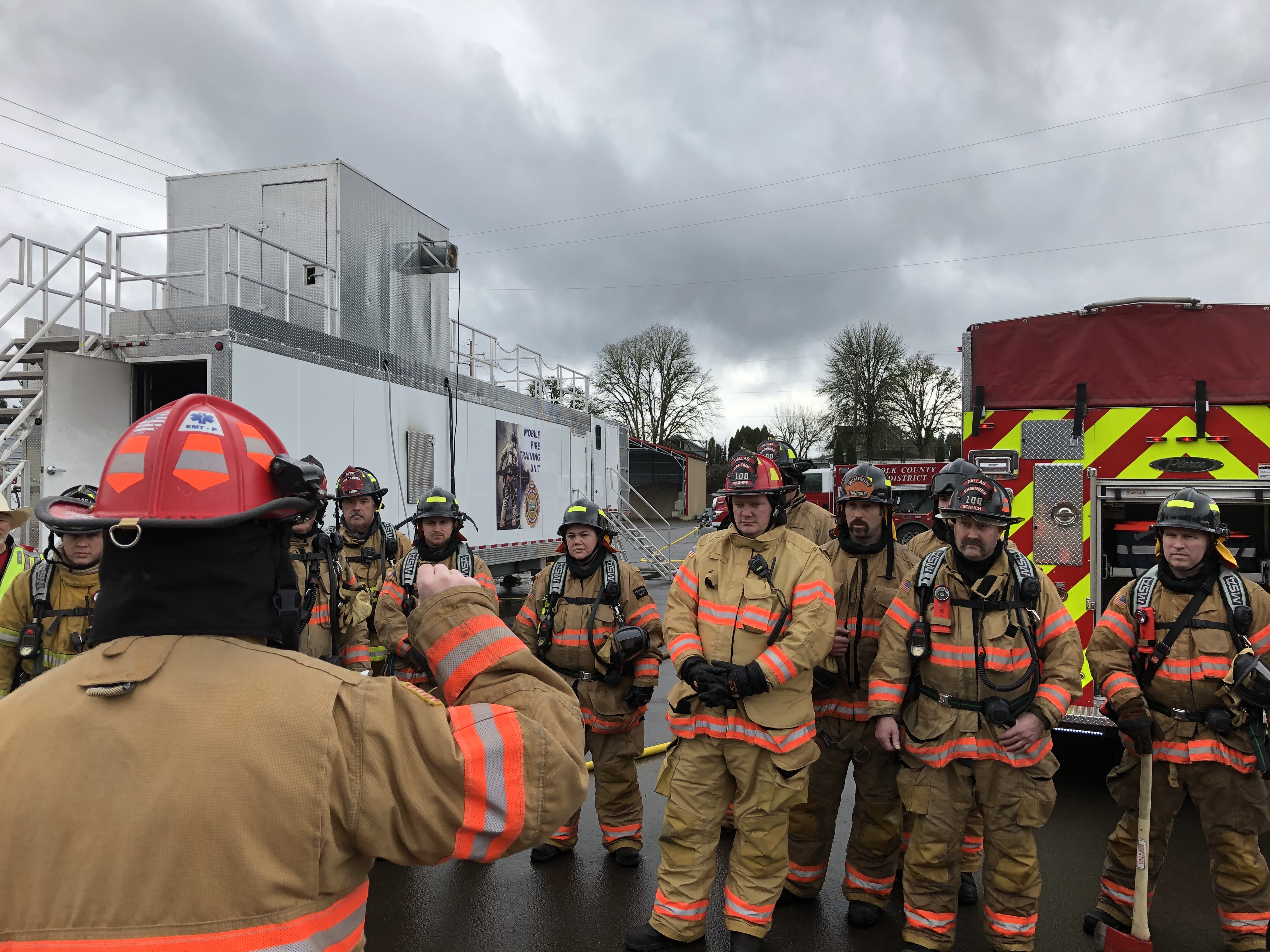 Over the past two weeks the Fire Training Program at the Oregon Department of Public Safety Standards and Training (DPSST) brought its 53-foot tractor trailer live fire training unit to Polk County. The unit was centrally located in Dallas with more than one-hundred firefighters from Dallas, Polk #1, Southwestern, Sheridan, and West Valley fire agencies participating in hands-on training during the daytime, evening and one nights and weekends.