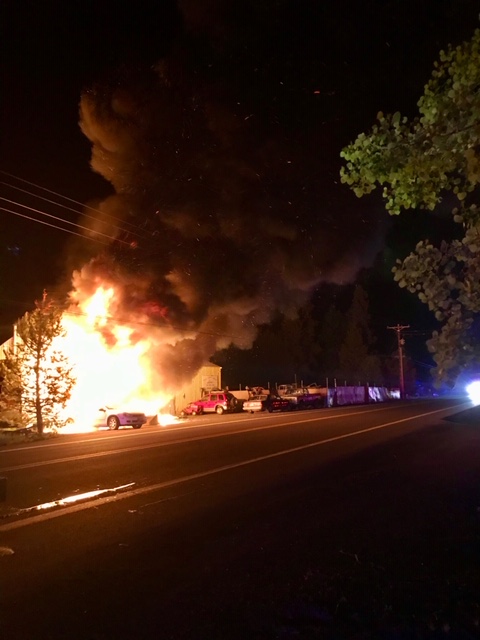On June 13, 2020 at approximately 1:09 a.m., Deschutes County Sheriff’s Office Deputies responded to a structural fire at High Lakes Towing and Recovery located at 15770 Burgess Rd in La Pine. Upon arrival, Deputies discovered the west half of the shop at High Lakes Towing was fully engulfed with flames extending through the roof. Several vehicles near the shop along with a 5th Wheel RV were also engulfed in flames. Nearby residents were quickly evacuated for their safety.