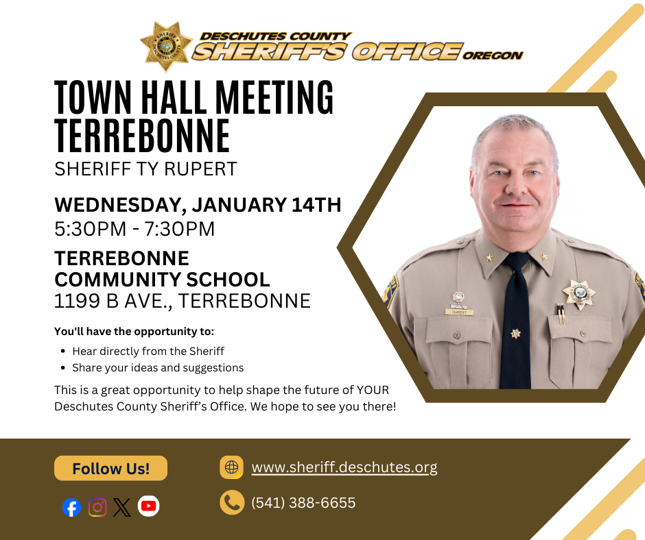 Terrebonne, OR – The Deschutes County Sheriff’s Office is reminding residents about this week’s community Town Hall meeting on Wednesday, January 14, from 5:30 p.m. to 7:30 p.m. at Terrebonne Community School.