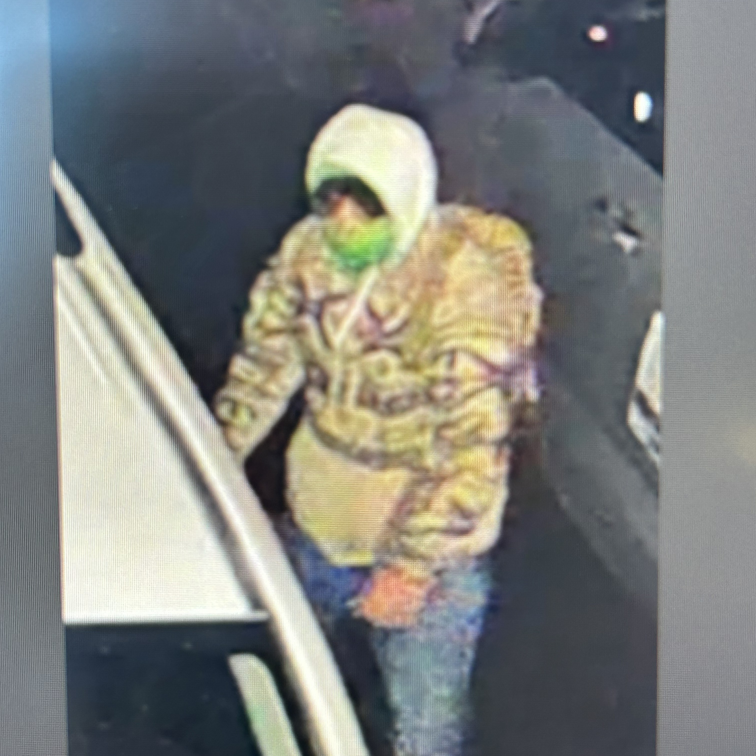 Based on neighborhood cameras, the suspect appears to be wearing a light-colored or patterned jacket, a light-colored hoodie with the hood up, blue jeans, and a bright green face covering or mask.