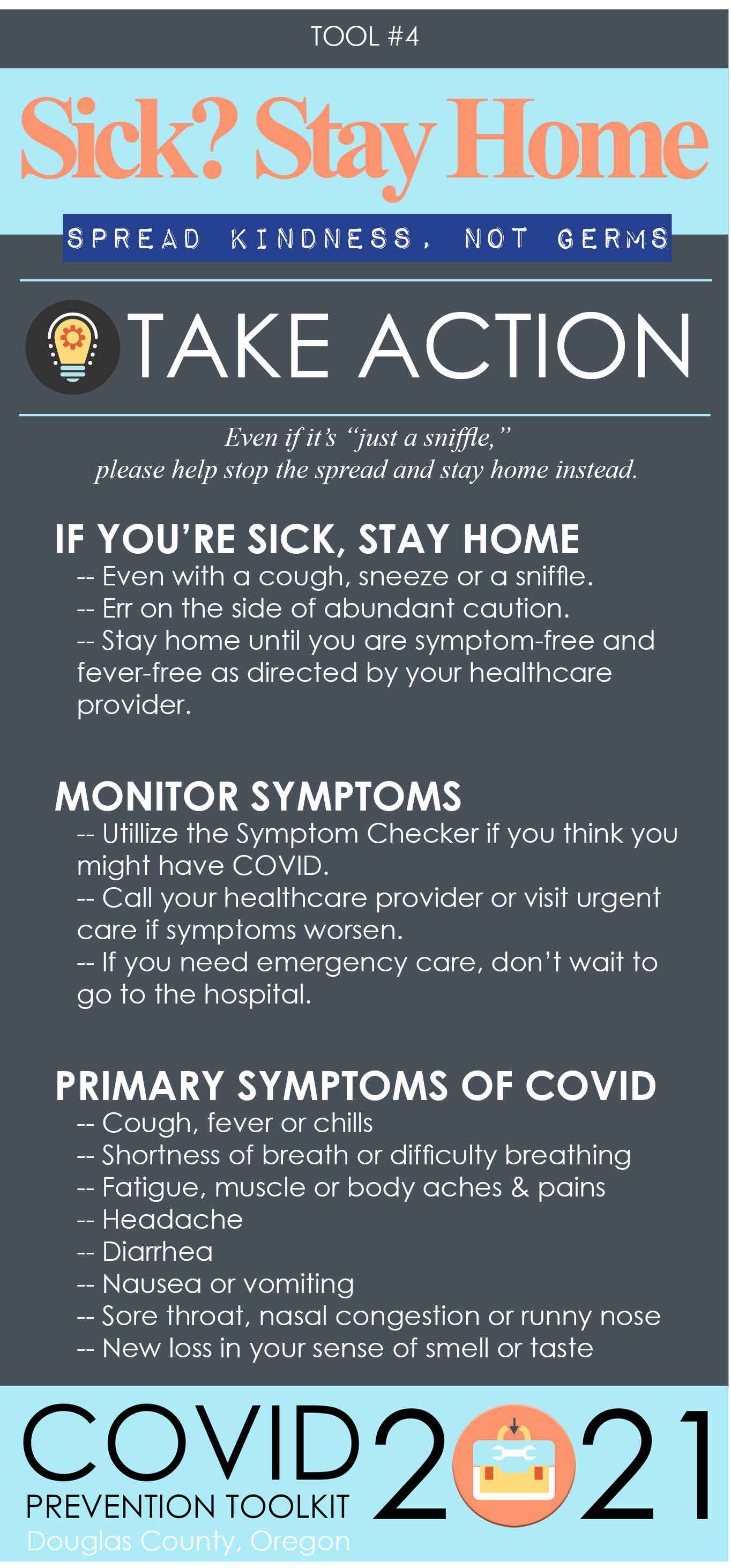 Pre-pandemic, rarely would a bout of the sniffles be something to worry about. But, right now with the enormous onslaught of new COVID cases, and the increasingly contagiousness nature of the Delta variant, we need to be EXTRA careful about spreading germs of any kind. As we prepare to enter the peak season for flu bugs, viruses and colds, we need to remember, it’s not just you that could become ill, you could unknowingly infect someone at work, someone at the gym, someone at school or someone in your family with COVID. The COVID virus is no longer just lurking in the bushes, it’s firmly taking root and spreading like blackberry vines in Douglas County. Which brings us to Toolkit Topic #4: If You Are Sick, Stay Home!