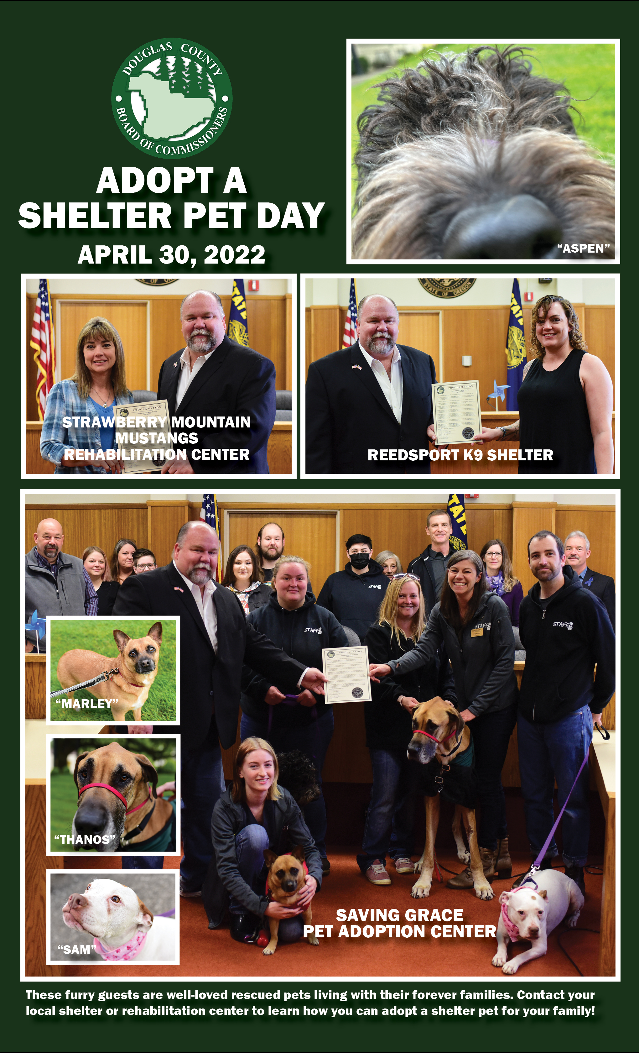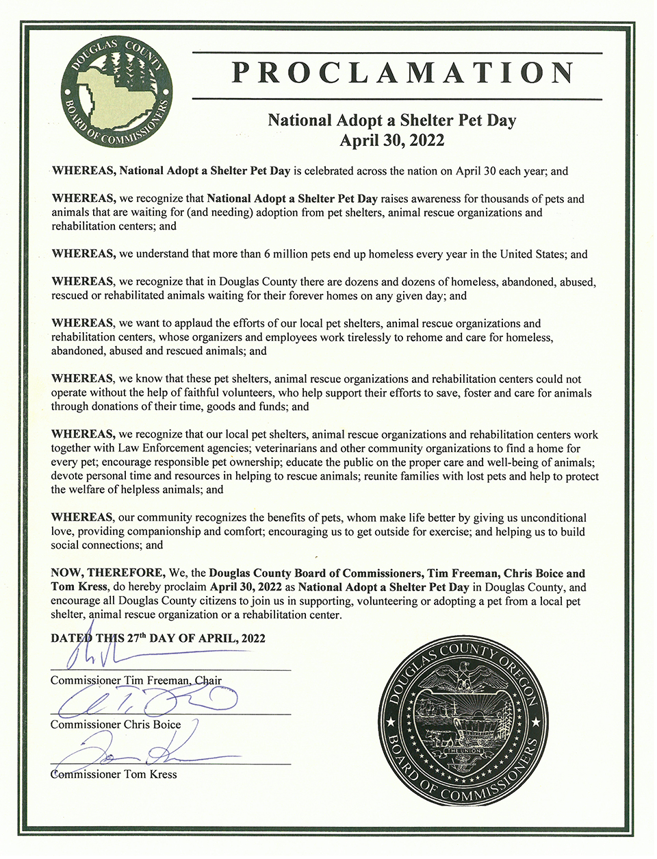 (Douglas County, Ore.) – Douglas County Commissioners Tim Freeman, Chris Boice and Tom Kress were excited to issue a proclamation in honor of Adopt a Shelter Pet Day during their weekly business meeting on Wednesday, April 27, 2022. Adopt a Shelter Pet Day, celebrated on April 30 each year was created to raise awareness for the millions of animals waiting for their forever homes in shelters across the United States. The proclamation also applauds the incredible work that our local pet shelters, animal rescue organizations and rehabilitation centers do to rehome and care for homeless, abandoned, abused and rescued animals. A copy of the live video presentation can be found on the Douglas County Government Facebook page at: https://www.facebook.com/DouglasCountyeGovernment.