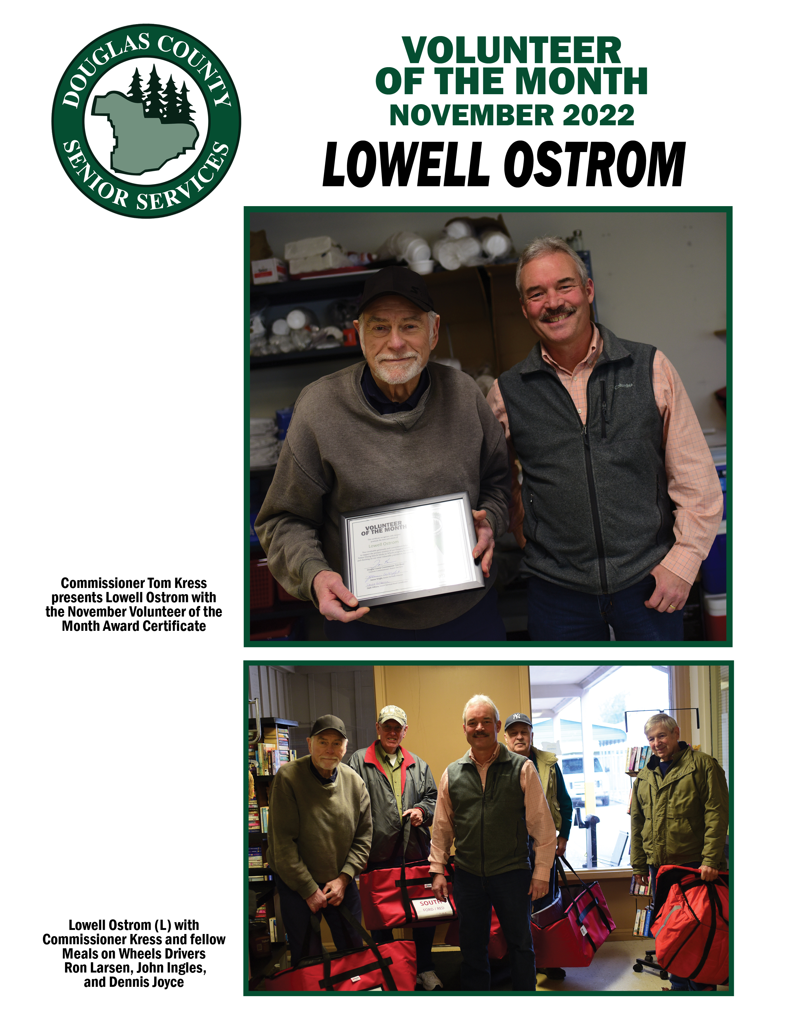 (Douglas County, Ore.) Douglas County Commissioners Tim Freeman, Chris Boice, and Tom Kress, along with our Douglas County Senior Services Department are honored to announce that Lowell Ostrom was awarded the Douglas County Senior Services Volunteer of the Month award for November 2022. Commissioner Tom Kress was honored to present Lowell with the award at the Bistro Sixty Senior Dining Site in Reedsport earlier this month. Bistro Sixty Reedsport which is located inside the Lower Umpqua Senior Center on 460 Winchester Avenue in Reedsport.