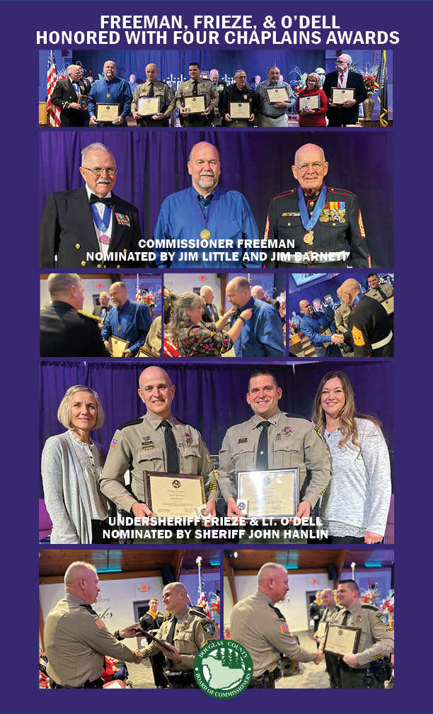 (Douglas County, Ore.) Douglas County Commissioners Chris Boice, Tim Freeman, and Tom Kress, along with Douglas County Sheriff John Hanlin are excited to recognize and congratulate Douglas County Commissioner Tim Freeman, Douglas County Undersheriff Jeff Frieze, and Douglas County Sheriff’s Lieutenant Brad O’Dell as the latest recipients of Four Chaplains Legion of Honor awards.